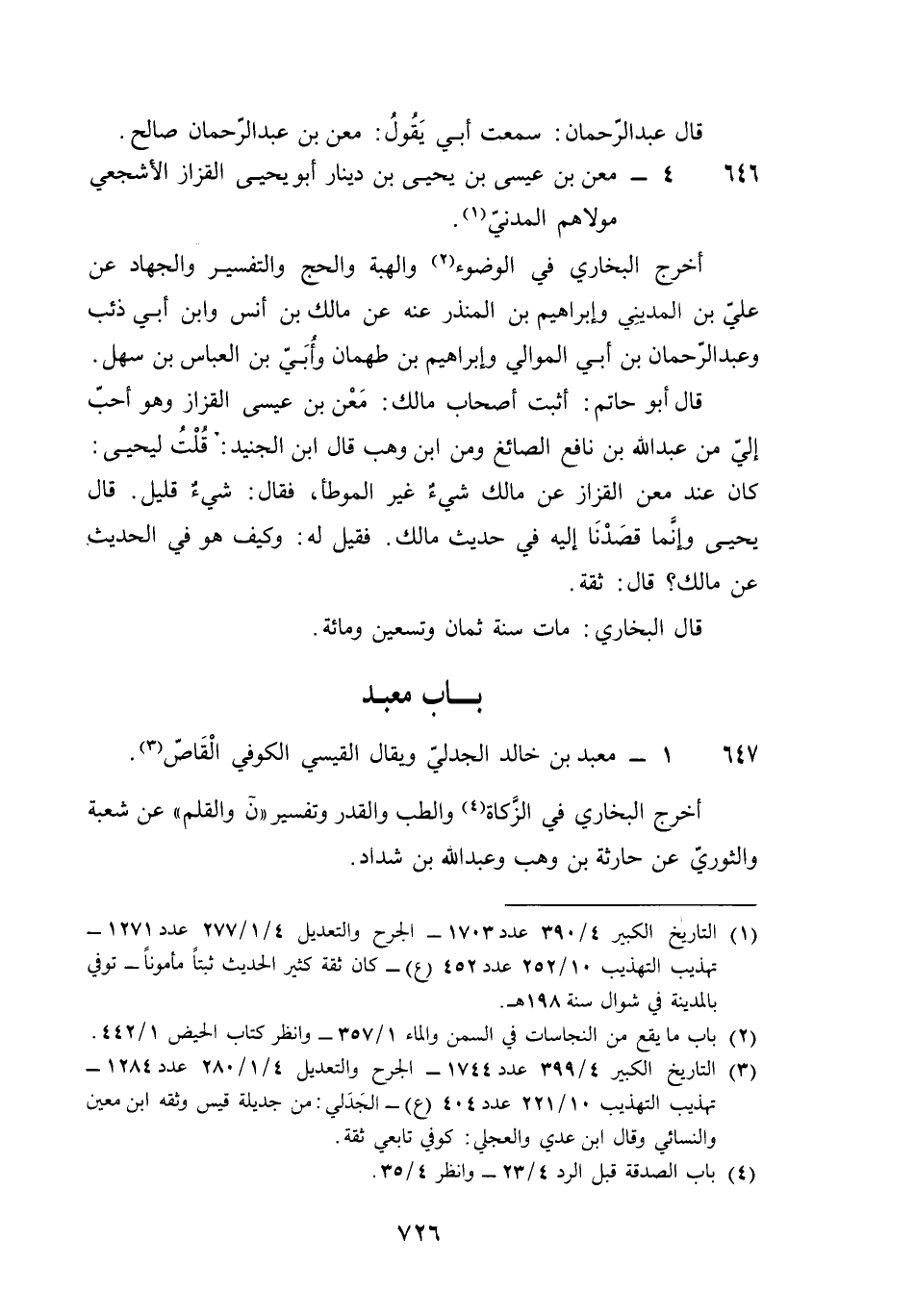 646 - معن بن عِيسَى بن يحيى بن دِينَار أَبُو يحيى الْقَزاز الْأَشْجَعِيّ مَوْلَاهُم الْمدنِي أخرج البُخَارِيّ فِي الْوضُوء وَالْهِبَة وَالْحج وَالتَّفْسِير وَالْجهَاد عَن عَليّ بن الْمَدِينِيّ وَإِبْرَاهِيم بن الْمُنْذر عَنهُ عَن مَالك بن أنس وَابْن أبي ذِئْب وَعبد الرَّحْمَن بن أبي الموَالِي وَإِبْرَاهِيم بن طهْمَان وَأبي بن الْعَبَّاس بن سهل قَالَ أَبُو حَاتِم أثبت أَصْحَاب مَالك معن بن عِيسَى الْقَزاز وَهُوَ أحب إِلَيّ من عبد الله بن نَافِع الصَّائِغ وَمن بن وهب قَالَ بن الْجُنَيْد قلت ليحيى كَانَ عِنْد معن الْقَزاز عَن مَالك شَيْء غير الْمُوَطَّأ فَقَالَ شَيْء قَلِيل قَالَ يحيى وَإِنَّمَا قصدنا إِلَيْهِ فِي حَدِيث مَالك فَقيل لَهُ وَكَيف هُوَ فِي الحَدِيث عَن مَالك قَالَ ثِقَة قَالَ البُخَارِيّ مَاتَ سنة ثَمَان وَتِسْعين وَمِائَة