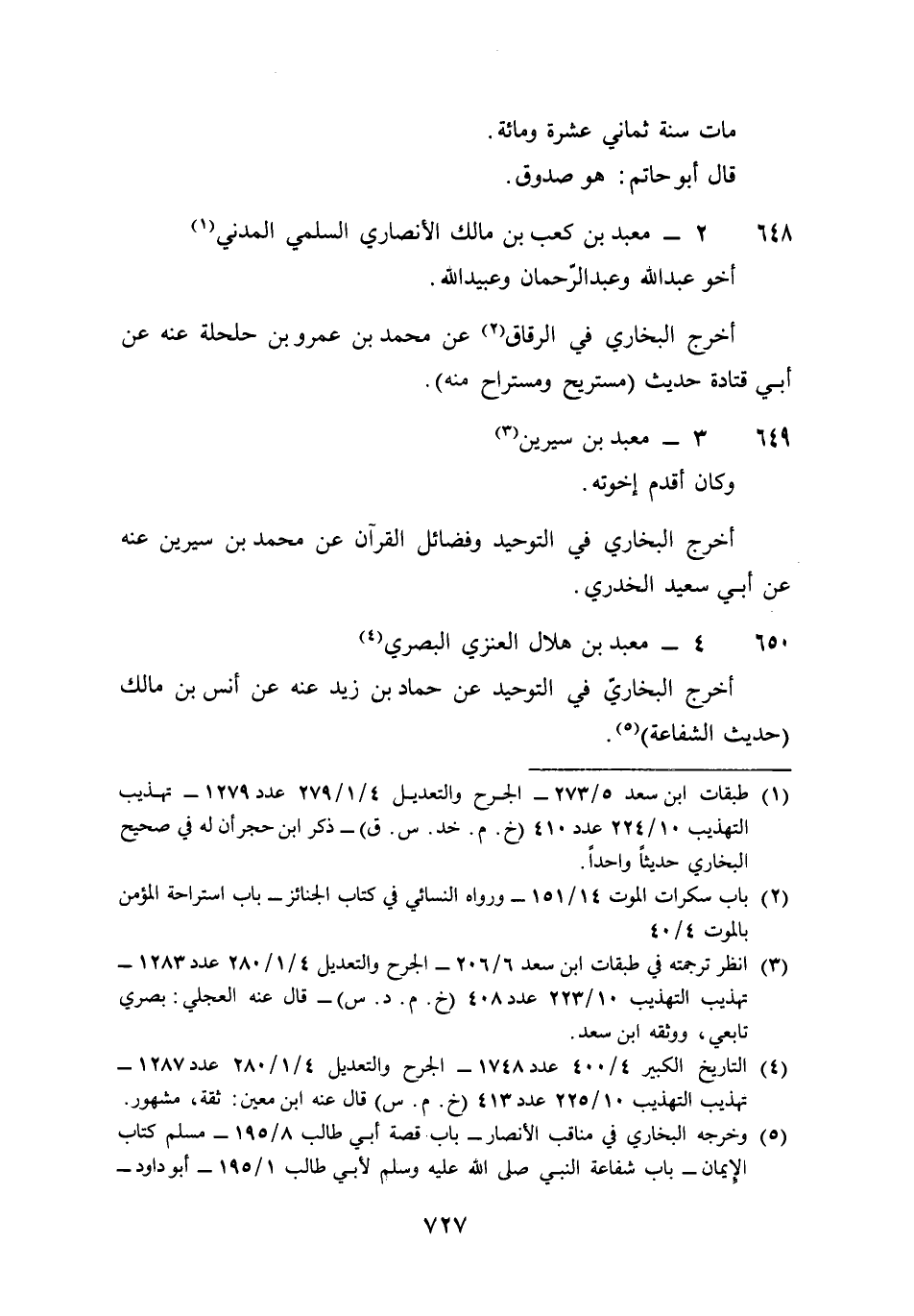 648 - معبد بن كَعْب بن مَالك الْأنْصَارِيّ السّلمِيّ الْمدنِي أَخُو عبد الله وَعبد الرَّحْمَن وَعبيد الله أخرج البُخَارِيّ فِي الرقَاق عَن مُحَمَّد بن عَمْرو بن حلحلة عَنهُ عَن أبي قَتَادَة حَدِيث مستريح ومستراح مِنْهُ