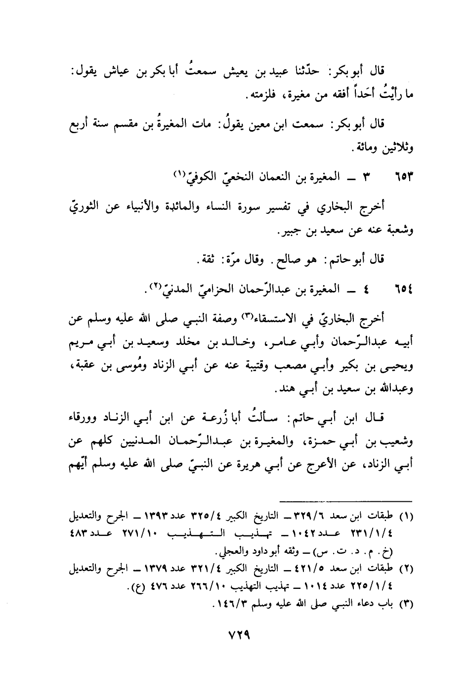 654 - الْمُغيرَة بن عبد الرَّحْمَن الْحزَامِي الْمدنِي أخرج البُخَارِيّ فِي الاسْتِسْقَاء وَصفه النَّبِي صلى الله عَلَيْهِ وَسلم عَن أَبِيه عبد الرَّحْمَن وَأبي عَامر وخَالِد بن مخلد وَسَعِيد بن أبي مَرْيَم وَيحيى بن بكير وَأبي مُصعب وقتيبة عَنهُ عَن أبي الزِّنَاد ومُوسَى بن عقبَة وَعبد الله بن سعيد بن أبي هِنْد قَالَ بن أبي حَاتِم سَأَلت أَبَا زرْعَة عَن بن أبي الزِّنَاد وورقاء وَشُعَيْب بن أبي حَمْزَة والمغيرة بن عبد الرَّحْمَن الْمَدَنِيين كلهم عَن أبي الزِّنَاد عَن الْأَعْرَج عَن أبي هُرَيْرَة عَن النَّبِي صلى الله عَلَيْهِ وَسلم أَيهمْ أحب إِلَيْك قَالَ وَرْقَاء أحب إِلَيّ من كلهم قلت بعده من أحب إِلَيْك قَالَ الْمُغيرَة أحب إِلَيّ من بن أبي الزِّنَاد وَشُعَيْب قلت فَابْن أبي الزِّنَاد وَشُعَيْب قَالَ شُعَيْب قَالَ عبد الرَّحْمَن أخبرنَا إِبْرَاهِيم بن يَعْقُوب الجوزقاني قَالَ سَمِعت أَحْمد بن حَنْبَل يَقُول الْمُغيرَة بن عبد الرَّحْمَن حزامي مَا بحَديثه بَأْس قَالَ البُخَارِيّ حَدثنِي عَيَّاش بن الْمُغيرَة فَقَالَ مَاتَ الْمُغيرَة بن عبد الرَّحْمَن سنة سِتّ وَثَمَانِينَ لسبع خلون من صفر يَوْم الْأَرْبَعَاء وَولد سنة أَربع أَو خمس وَعشْرين وَمِائَة