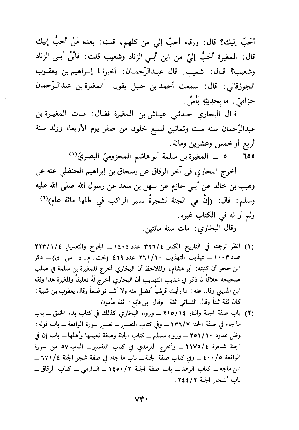 655 - الْمُغيرَة بن سَلمَة أَبُو هَاشم المَخْزُومِي الْبَصْرِيّ أخرج البُخَارِيّ فِي آخر الرقَاق عَن إِسْحَاق بن إِبْرَاهِيم الْحَنْظَلِي عَنهُ عَن وهيب بن خَالِد عَن أبي حَازِم عَن سهل بن سعد عَن رَسُول الله صلى الله عَلَيْهِ وَسلم وَسلم قَالَ إِن فِي الْجنَّة لشَجَرَة يسير الرَّاكِب فِي ظلها مائَة عَام وَلم أر لَهُ فِي الْكتاب غَيره وَقَالَ البُخَارِيّ مَاتَ سنة مِائَتَيْنِ
