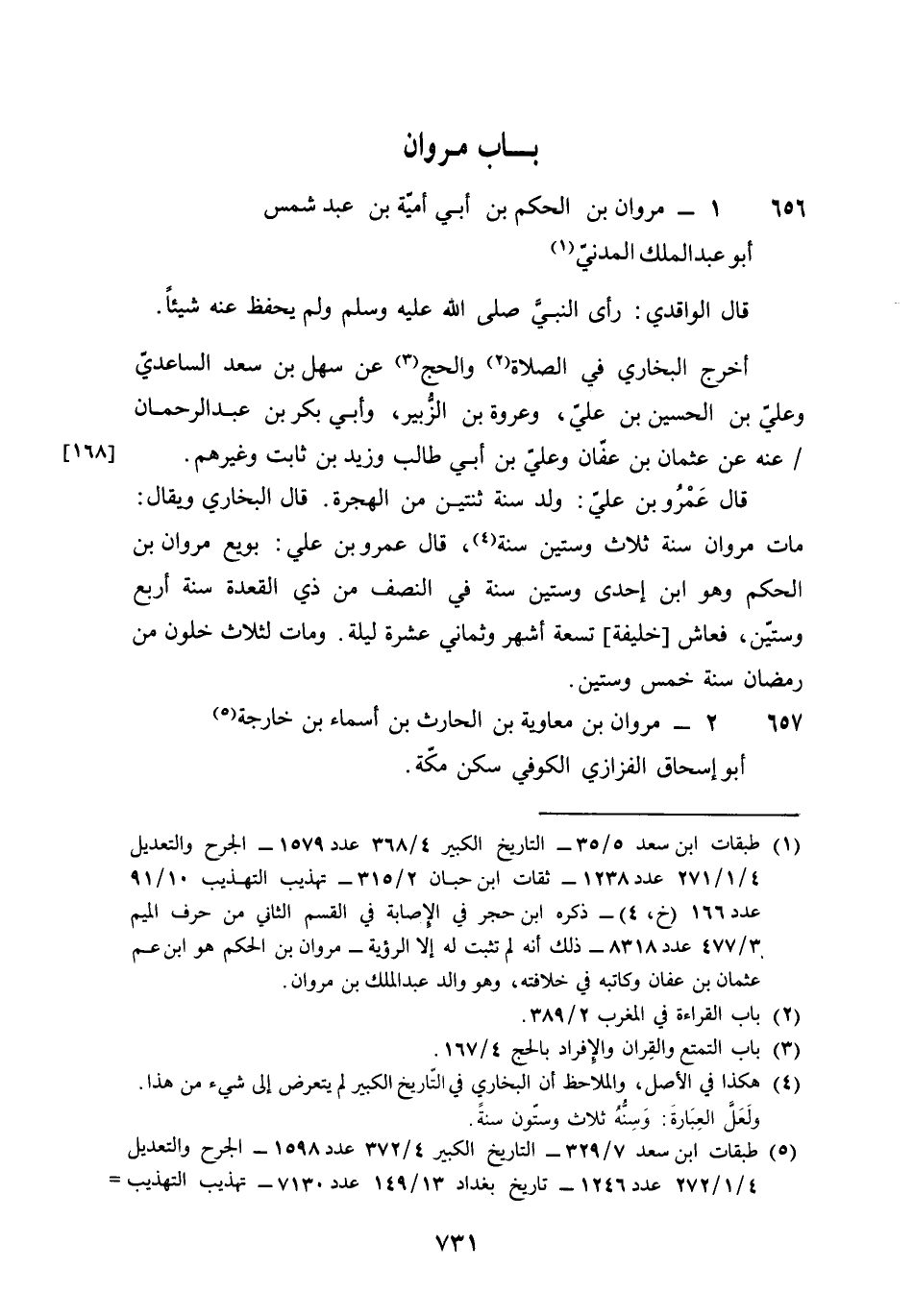 656 - مَرْوَان بن الحكم بن أبي أُميَّة بن عبد شمس أَبُو عبد الْملك الْمدنِي قَالَ الْوَاقِدِيّ رأى النَّبِي صلى الله عَلَيْهِ وَسلم وَلم يحفظ عَنهُ شَيْئا أخرج البُخَارِيّ فِي الصَّلَاة وَالْحج عَن سهل بن سعد السَّاعِدِيّ وَعلي بن الْحُسَيْن بن عَليّ وَعُرْوَة بن الزبير وَأبي بكر بن عبد الرَّحْمَن عَنهُ عَن عُثْمَان بن عَفَّان وَعلي بن أبي طَالب وَزيد بن ثَابت وَغَيرهم قَالَ عَمْرو بن عَليّ ولد سنة ثِنْتَيْنِ من الْهِجْرَة قَالَ البُخَارِيّ وَيُقَال مَاتَ مَرْوَان سنة ثَلَاث وَسِتِّينَ سنة قَالَ عَمْرو بن عَليّ بُويِعَ مَرْوَان بن الحكم وَهُوَ بن إِحْدَى وَسِتِّينَ سنة فِي النّصْف من ذِي الْقعدَة سنة أَربع وَسِتِّينَ فَعَاشَ خَليفَة تِسْعَة أشهر وثماني عشرَة لَيْلَة وَمَات لثلاث خلون من رَمَضَان سنة خمس وَسِتِّينَ
