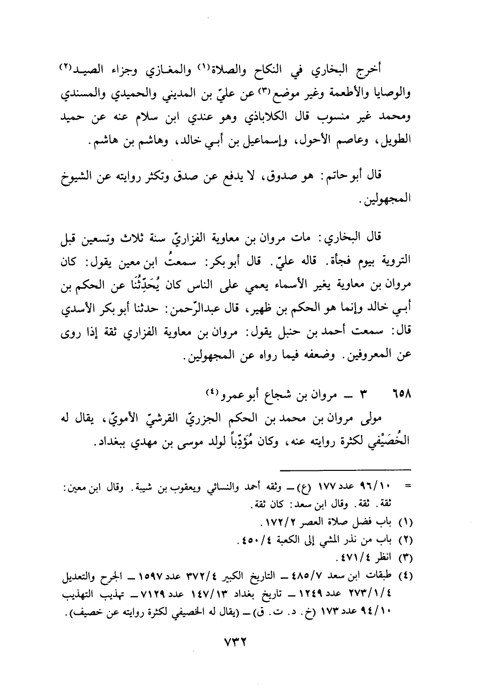 658 - مَرْوَان بن شُجَاع أَبُو عَمْرو مولى مَرْوَان بن مُحَمَّد بن الحكم الْجَزرِي الْقرشِي الْأمَوِي يُقَال لَهُ الخصيفي لِكَثْرَة رِوَايَته عَنهُ وَكَانَ مؤدبا لولد مُوسَى بن مهْدي بِبَغْدَاد أخرج البُخَارِيّ فِي الشَّهَادَات والطب عَن سعيد بن سُلَيْمَان وسريج بن يُونُس وَأحمد بن منيع عَنهُ عَن سَالم الْأَفْطَس قَالَ البُخَارِيّ مَاتَ سنة أَربع وَثَلَاثِينَ وَمِائَة قَالَ أَبُو حَاتِم الرَّازِيّ هُوَ صَالح لَيْسَ بِذَاكَ الْقوي فِي بعض مَا يروي مَنَاكِير يكْتب حَدِيثه قَالَ أَبُو بكر سَمِعت بن معِين يَقُول هُوَ ثِقَة