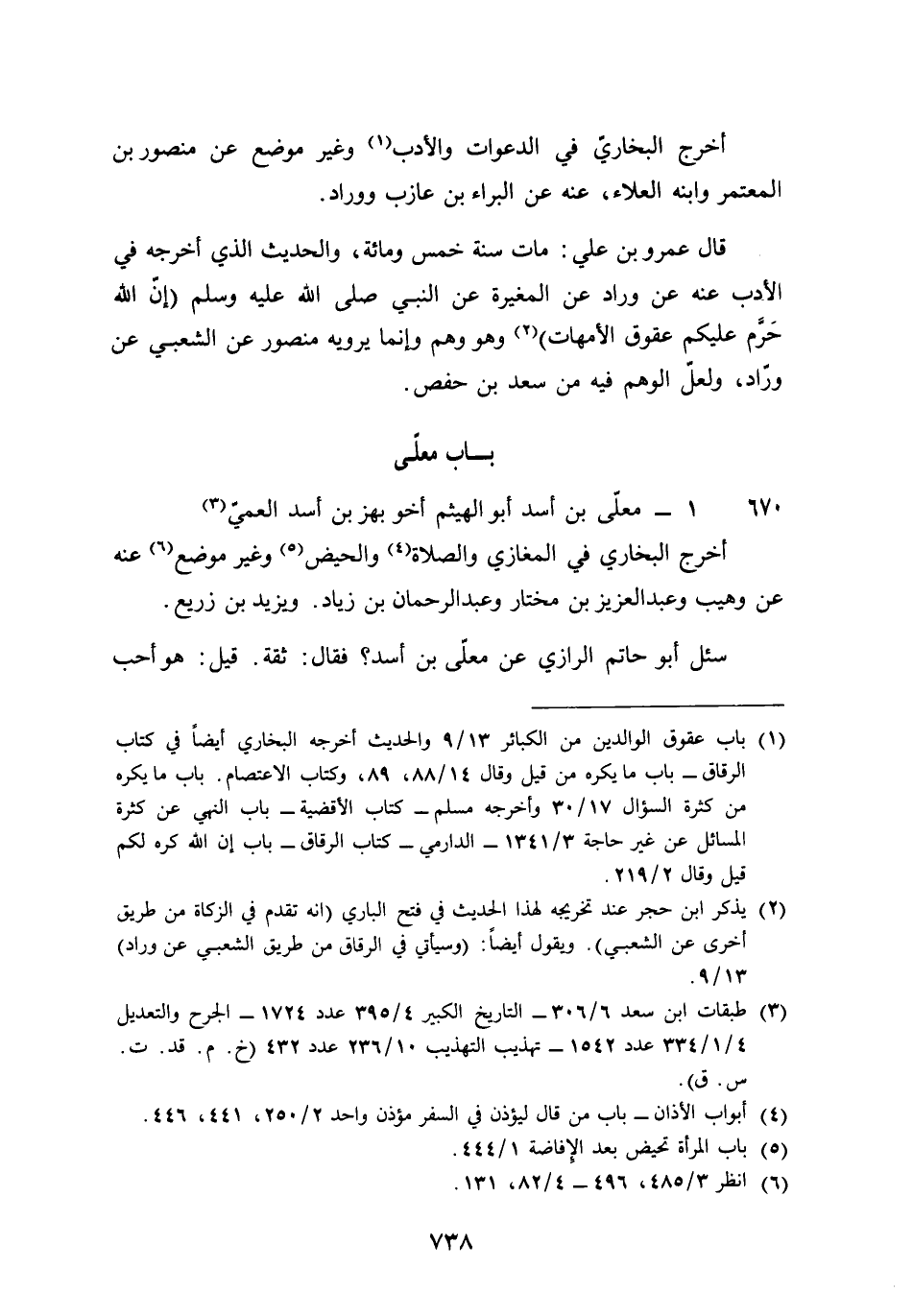 670 - مُعلى بن أَسد أَبُو الْهَيْثَم أَخُو بهز بن أَسد الْعمي أخرج البُخَارِيّ فِي الْمَغَازِي وَالصَّلَاة وَالْحيض وَغير مَوضِع عَنهُ عَن وهيب وَعبد الْعَزِيز بن مُخْتَار وَعبد الرَّحْمَن بن زِيَاد وَيزِيد بن زُرَيْع سُئِلَ أَبُو حَاتِم الرَّازِيّ عَن مُعلى بن أَسد فَقَالَ ثِقَة قيل هُوَ أحب إِلَيْك أَو أَحْمد بن يُونُس قَالَ هُوَ أحب إِلَيّ من أَحْمد قَالَ عبد الرَّحْمَن بن أبي حَاتِم مَا أعلم أَنِّي وجدت لَهُ خطأ غير حَدِيث وَاحِد قَالَ البُخَارِيّ مَاتَ بَين عشر إِلَى عشْرين وَمِائَتَيْنِ