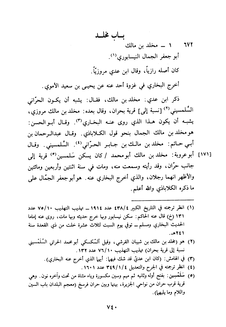 672 - مخلد بن مَالك أَبُو جَعْفَر الْجمال النَّيْسَابُورِي كَانَ أَصله رازيا وَقَالَ بن عدي مروزيا أخرج البُخَارِيّ فِي غَزْوَة أحد عَنهُ عَن يحيى بن سعيد الْأمَوِي ذكر بن عدي مخلد بن مَالك فَقَالَ يشبه أَن يكون الْحَرَّانِي السلمسيني نِسْبَة إِلَى قَرْيَة بحران وَقَالَ بعده مخلد بن مَالك مروزي يشبه أَن يكون هَذَا الَّذِي روى عَنهُ البُخَارِيّ وَقَالَ أَبُو الْحسن هُوَ مخلد بن مَالك الْجمال بِنَحْوِ قَول الكلاباذي وَقَالَ عبد الرَّحْمَن بن أبي حَاتِم مخلد بن مَالك بن جَابر الْحَرَّانِي السلمسيني وَقَالَ أَبُو عرُوبَة مخلد بن مَالك أَبُو مُحَمَّد كَانَ يسكن سلمسين قَرْيَة إِلَى جَانب حران وَقد رَأَيْته وَسمعت مِنْهُ وَمَات فِي سنة اثْنَتَيْنِ وَأَرْبَعين وَمِائَتَيْنِ وَالْأَظْهَر أَنَّهُمَا رجلَانِ وَالَّذِي أخرج البُخَارِيّ عَنهُ هُوَ أَبُو جَعْفَر الْجمال على مَا ذكره الكلاباذي وَالله أعلم