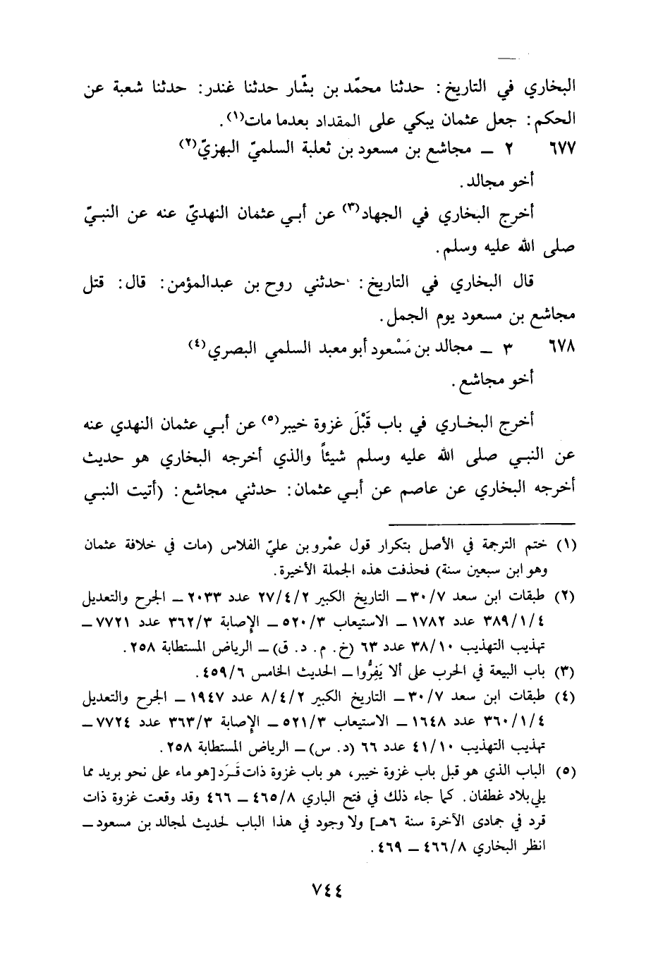678 - مجَالد بن مَسْعُود أَبُو معبد السّلمِيّ الْبَصْرِيّ أَخُو مجاشع أخرج البُخَارِيّ فِي بَاب قبل غَزْوَة خَيْبَر عَن أبي عُثْمَان النَّهْدِيّ عَنهُ عَن النَّبِي صلى الله عَلَيْهِ وَسلم شَيْئا وَالَّذِي أخرجه البُخَارِيّ هُوَ حَدِيث أخرجه البُخَارِيّ عَن عَاصِم عَن أبي عُثْمَان حَدثنِي مجاشع أتيت النَّبِي صلى الله عَلَيْهِ وَسلم بأخي بعد الْفَتْح ليبايعه على الْهِجْرَة الحَدِيث قَالَ فَلَقِيت أَبَا معبد وَكَانَ أكبرهما فَقَالَ صدق فَيحْتَمل أَن يكون عَمْرو بن عَليّ لم يعْتد بِهِ لما لم ينْفَرد بروايته وَإِنَّمَا صدق أَخَاهُ فِي رِوَايَته واعتد بِهِ الكلاباذي لما كَانَ طَرِيقه طَرِيق الْخَبَر عَن النَّبِي صلى الله عَلَيْهِ وَسلم