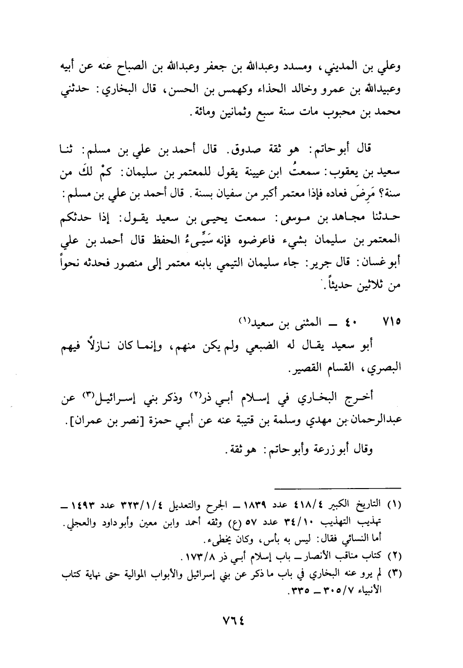 715 - الْمثنى بن سعيد أَبُو سعيد يُقَال لَهُ الضبعِي وَلم يكن مِنْهُم وَإِنَّمَا كَانَ نازلا فيهم الْبَصْرِيّ القسام الْقصير أخرج البُخَارِيّ فِي إِسْلَام أبي ذَر وَذكر بني إِسْرَائِيل عَن عبد الرَّحْمَن بن مهْدي وَسَلَمَة بن قُتَيْبَة عَنهُ عَن أبي حَمْزَة نصر بن عمرَان وَقَالَ أَبُو زرْعَة وَأَبُو حَاتِم هُوَ ثِقَة