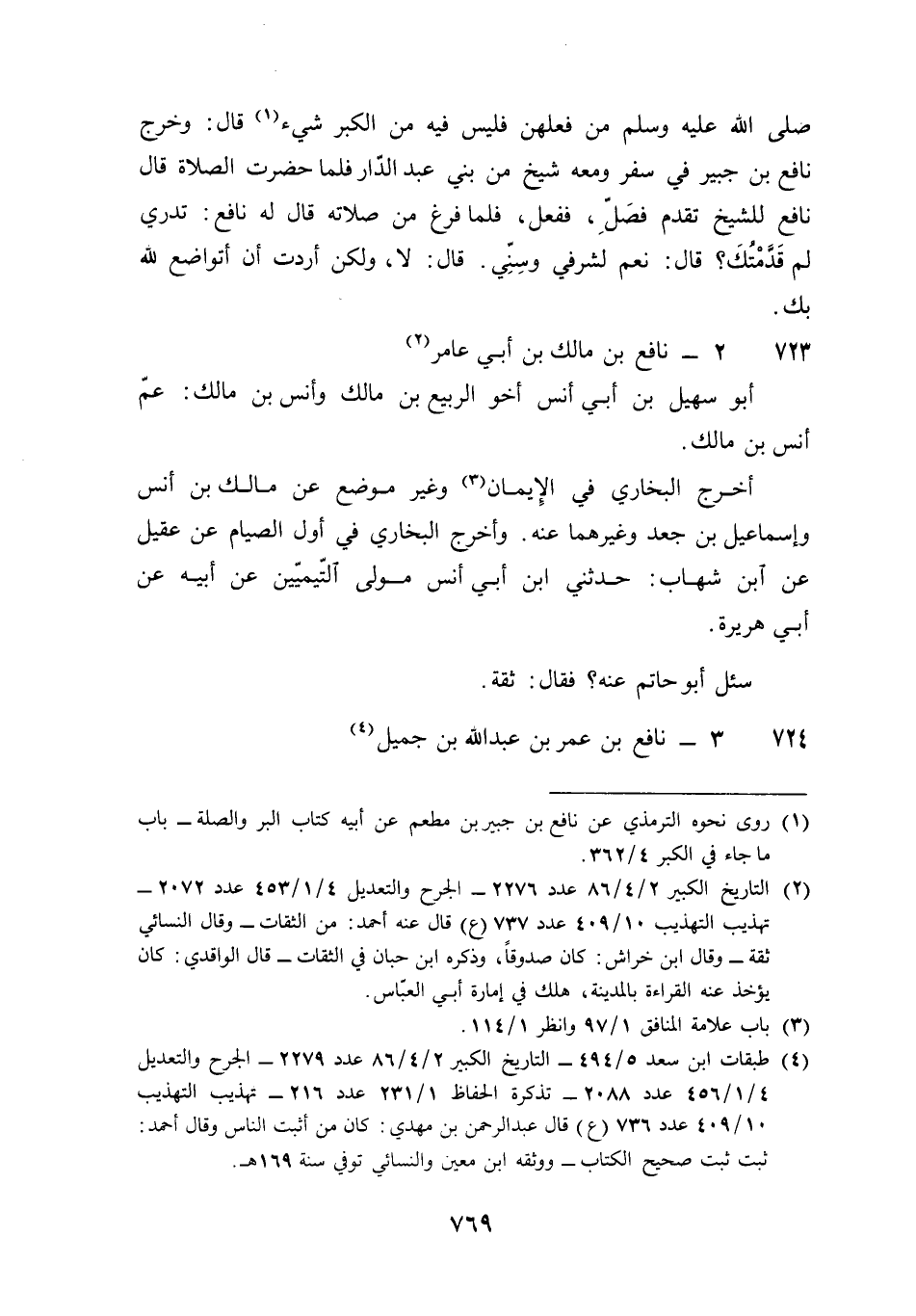 723 - نَافِع بن مَالك بن أبي عَامر أَبُو سُهَيْل بن أبي أنس أَخُو الرّبيع بن مَالك وَأنس بن مَالك عَم أنس بن مَالك أخرج البُخَارِيّ فِي الْإِيمَان وَغير مَوضِع عَن مَالك بن أنس وَإِسْمَاعِيل بن جعد وَغَيرهمَا عَنهُ وَأخرج البُخَارِيّ فِي أول الصّيام عَن عقيل عَن بن شهَاب حَدثنِي بن أبي أنس مولى التيميين عَن أَبِيه عَن أبي هُرَيْرَة سُئِلَ أَبُو حَاتِم عَنهُ فَقَالَ ثِقَة
