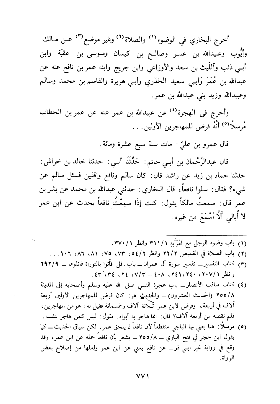 أخرج البُخَارِيّ فِي الْوضُوء وَالصَّلَاة وَغير مَوضِع عَن مَالك وَأَيوب وَعبيد الله بن عمر وَصَالح بن كيسَان ومُوسَى بن عقبَة وَابْن أبي ذِئْب وَاللَّيْث بن سعد وَالْأَوْزَاعِيّ وَابْن جريج وَابْنه عمر بن نَافِع عَنهُ عَن عبد الله بن عمر وَأبي سعيد الْخُدْرِيّ وَأبي هُرَيْرَة وَالقَاسِم بن مُحَمَّد وَسَالم وَعبيد الله وَزيد بني عبد الله بن عمر وَأخرج فِي الْهِجْرَة عَن عبيد الله بن عمر عَنهُ عَن عمر بن الْخطاب مُرْسلا أَنه فرض للمهاجرين الْأَوَّلين قَالَ عَمْرو بن عَليّ مَاتَ سنة سبع عشرَة وَمِائَة قَالَ عبد الرَّحْمَن بن أبي حَاتِم حَدثنَا أبي حَدثنَا خَالِد بن خرَاش حَدثنَا حَمَّاد بن زيد عَن رَاشد قَالَ كَانَ سَالم وَنَافِع واقفين فَسئلَ سَالم عَن شَيْء فَقَالَ سلوا نَافِعًا قَالَ البُخَارِيّ حَدثنِي عبد الله بن مُحَمَّد عَن بشر بن عمر قَالَ سَمِعت مَالِكًا يَقُول كنت إِذا سَمِعت نَافِعًا يحدث عَن بن عمر لَا أُبَالِي أَلا أسمع من غَيره