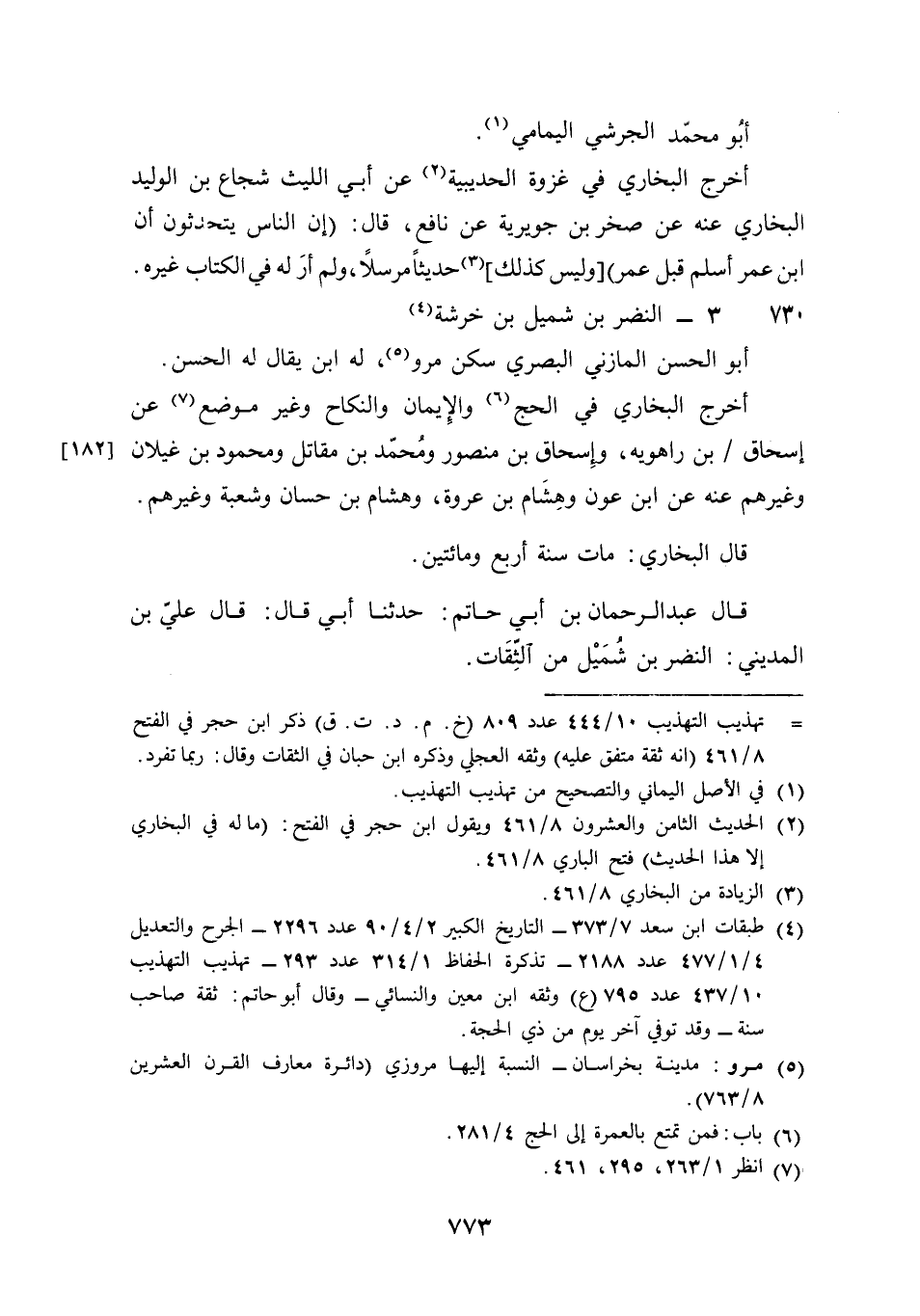 730 - النَّضر بن شُمَيْل بن خَرشَة أَبُو الْحسن الْمَازِني الْبَصْرِيّ سكن مرو لَهُ بن يُقَال لَهُ الْحسن أخرج البُخَارِيّ فِي الْحَج وَالْإِيمَان وَالنِّكَاح وَغير مَوضِع عَن إِسْحَاق بن رَاهَوَيْه وَإِسْحَاق بن مَنْصُور وَمُحَمّد بن مقَاتل ومحمود بن غيلَان وَغَيرهم عَنهُ عَن بن عون وَهِشَام بن عُرْوَة وَهِشَام بن حسان وَشعْبَة وَغَيرهم قَالَ البُخَارِيّ مَاتَ سنة أَربع وَمِائَتَيْنِ قَالَ عبد الرَّحْمَن بن أبي حَاتِم حَدثنَا أبي قَالَ قَالَ عَليّ بن الْمَدِينِيّ النَّضر بن شُمَيْل من الثِّقَات