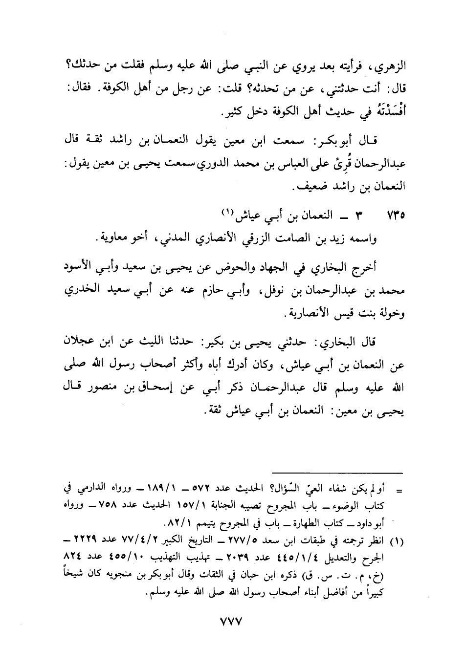 735 - النُّعْمَان بن أبي عَيَّاش واسْمه زيد بن الصَّامِت الزرقي الْأنْصَارِيّ الْمدنِي أَخُو مُعَاوِيَة أخرج البُخَارِيّ فِي الْجِهَاد والحوض عَن يحيى بن سعيد وَأبي الْأسود مُحَمَّد بن عبد الرَّحْمَن بن نَوْفَل وَأبي حَازِم عَنهُ عَن أبي سعيد الْخُدْرِيّ وَخَوْلَة بنت قيس الْأَنْصَارِيَّة قَالَ البُخَارِيّ حَدثنِي يحيى بن بكير حَدثنَا اللَّيْث عَن بن عجلَان عَن النُّعْمَان بن أبي عَيَّاش وَكَانَ أدْرك أَبَاهُ وَأكْثر أَصْحَاب رَسُول الله صلى الله عَلَيْهِ وَسلم قَالَ عبد الرَّحْمَن ذكر أبي عَن إِسْحَاق بن مَنْصُور قَالَ يحيى بن معِين النُّعْمَان بن أبي عَيَّاش ثِقَة