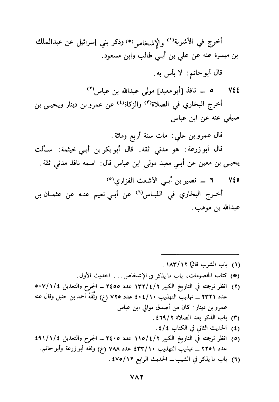 744 - نَافِذ أَبُو معبد مولى عبد الله بن عَبَّاس أخرج البُخَارِيّ فِي الصَّلَاة وَالزَّكَاة عَن عَمْرو بن دِينَار وَيحيى بن صَيْفِي عَنهُ عَن بن عَبَّاس قَالَ عَمْرو بن عَليّ مَاتَ سنة أَربع وَمِائَة قَالَ أَبُو زرْعَة هُوَ مدنِي ثِقَة قَالَ أَبُو بكر بن أبي خَيْثَمَة سَأَلت يحيى بن معِين عَن أبي معبد مولى بن عَبَّاس قَالَ اسْمه نَافِذ مدنِي ثِقَة