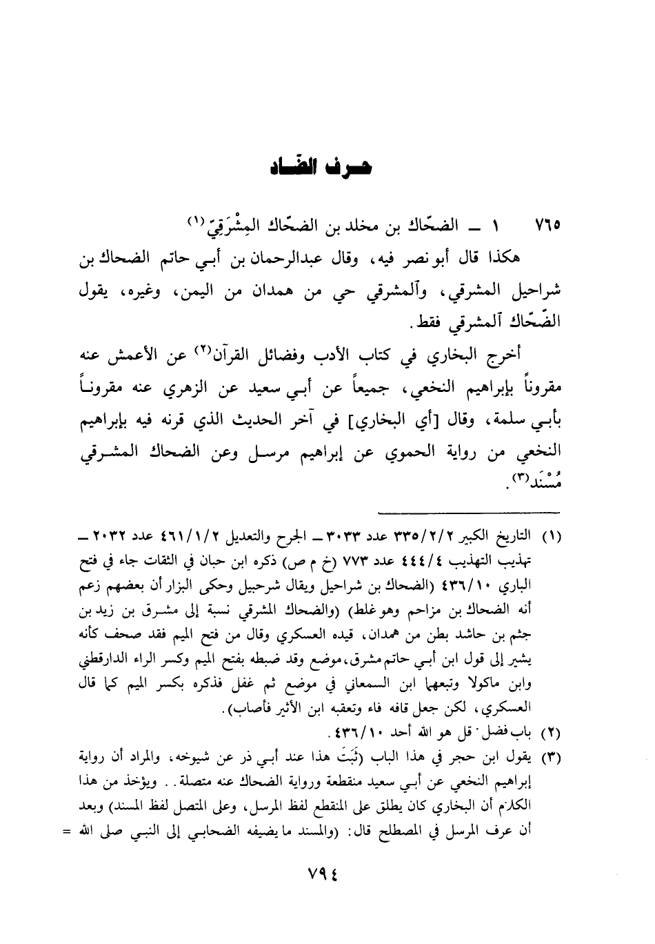 765 - الضَّحَّاك بن مخلد بن الضَّحَّاك المشرقي هَكَذَا قَالَ أَبُو نصر فِيهِ وَقَالَ عبد الرَّحْمَن بن أبي حَاتِم الضَّحَّاك بن شرَاحِيل المشرقي والمشرقي حَيّ من هَمدَان من الْيمن وَغَيره يَقُول الضَّحَّاك المشرقي فَقَط أخرج البُخَارِيّ فِي كتاب الْأَدَب وفضائل الْقُرْآن عَن الْأَعْمَش عَنهُ مَقْرُونا بإبراهيم النَّخعِيّ جَمِيعًا عَن أبي سعيد عَن الزُّهْرِيّ عَنهُ مَقْرُونا بِأبي سَلمَة وَقَالَ أَي البُخَارِيّ فِي آخر الحَدِيث الَّذِي قرنة فِيهِ بإبراهيم النَّخعِيّ من رِوَايَة الْحَمَوِيّ عَن إِبْرَاهِيم مُرْسل وَعَن الضَّحَّاك المشرقي مُسْند