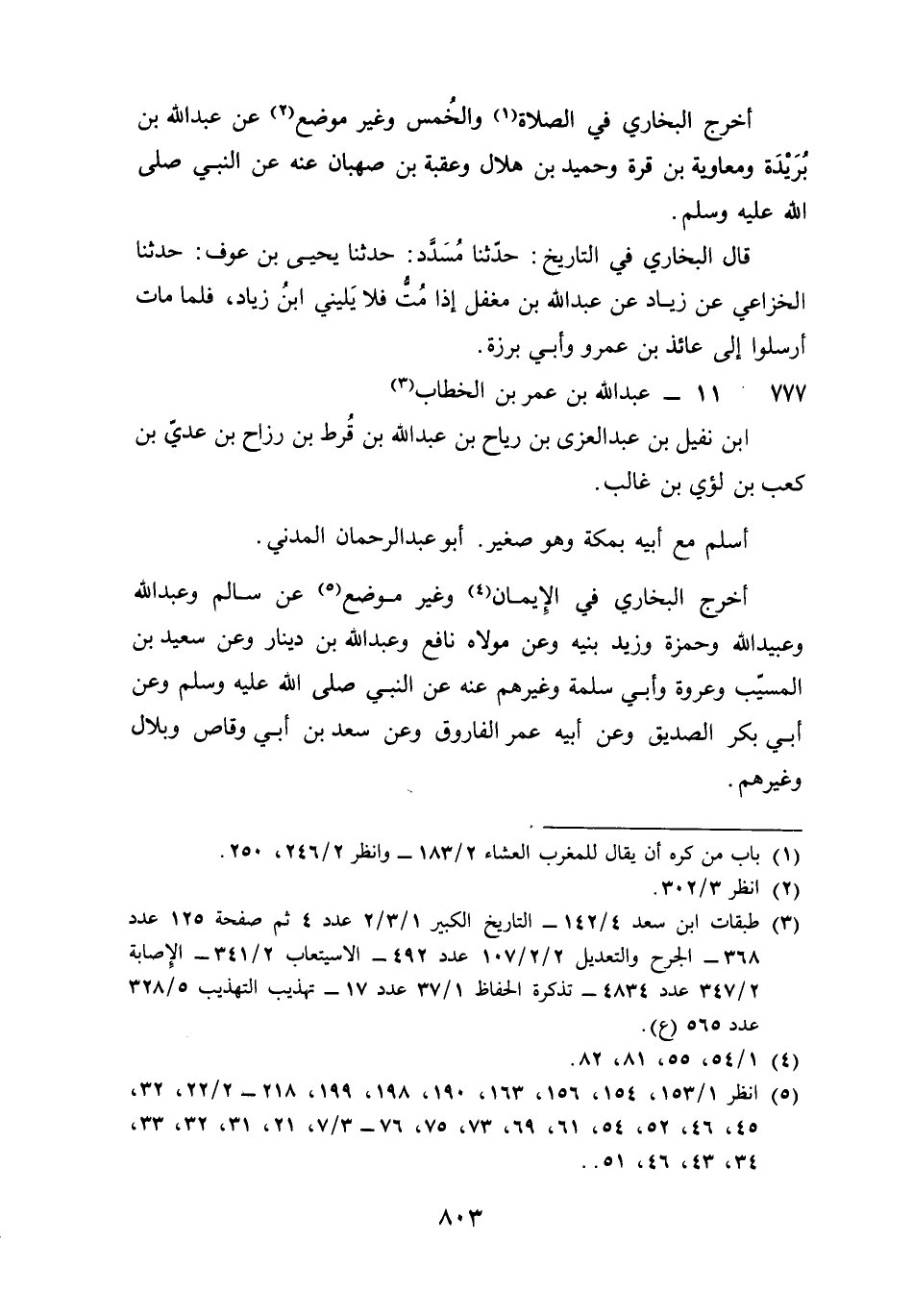 777 - عبد الله بن عمر بن الْخطاب بن نفَيْل بن عبد الْعُزَّى بن ريَاح بن عبد الله بن قرط بن رزاح بن عدي بن كَعْب بن لؤَي بن غَالب أسلم مَعَ أَبِيه بِمَكَّة وَهُوَ صَغِير أَبُو عبد الرَّحْمَن الْمدنِي أخرج البُخَارِيّ فِي الْإِيمَان وَغير مَوضِع عَن سَالم وَعبد الله وَعبيد الله وَحَمْزَة وَزيد بنيه وَعَن مَوْلَاهُ نَافِع وَعبد الله بن دِينَار وَعَن سعيد بن الْمسيب وَعُرْوَة وَأبي سَلمَة وَغَيرهم عَنهُ عَن النَّبِي صلى الله عَلَيْهِ وَسلم وَعَن أبي بكر الصّديق وَعَن أَبِيه عمر الْفَارُوق وَعَن سعد بن أبي وَقاص وبلال وَغَيرهم قَالَ البُخَارِيّ فِي التَّارِيخ قَالَ أَبُو نعيم مَاتَ سنة ثَلَاث وَسبعين قَالَ عَمْرو بن عَليّ مَاتَ بِمَكَّة وَدفن بفخ سنة أَربع وَسبعين وَهُوَ بن أَربع وَثَمَانِينَ سنة قَالَ البُخَارِيّ وَحدثنَا الأوسي حَدثنِي مَالك أَن عبد الله بن عمر بلغ سبعا وَثَمَانِينَ سنة قَالَ البُخَارِيّ حَدثنَا مُوسَى بن إِسْمَاعِيل حَدثنَا عَمْرو بن يحيى بن سعيد بن عَمْرو بن سعيد بن الْعَاصِ السعيدي قَالَ أَخْبرنِي جدي معبد بن عَمْرو قدم حَاجا فَدخل الْحجَّاج عَلَيْهِ وَقد أَصَابَهُ زج رمح فَقَالَ من أَصَابَك قَالَ أصابني من أَمر بِحمْل السِّلَاح فِي مَكَان لَا يحل فِيهِ حمله قَالَ عُثْمَان حَدثنَا بن إِدْرِيس عَن عبيد الله بن نَافِع عَن بن عمر قَالَ عرضت على النَّبِي صلى الله عَلَيْهِ وَسلم وَأَنا بن أَربع عشرَة سنة فَلم يجزني فِي الْقِتَال وَعرضت عَلَيْهِ يَوْم الخَنْدَق وَأَنا بن خمس عشرَة فأجازني قَالَ أَبُو بكر حَدثنَا أَحْمد بن شبويه حَدثنَا الْفضل بن مُوسَى عَن أبي حَمْزَة عَن إِبْرَاهِيم الصَّائِغ عَن نَافِع أَن بن عمر كَانَ لَهُ كتاب ينظر فِيهِ يَعْنِي فِي الْعلم