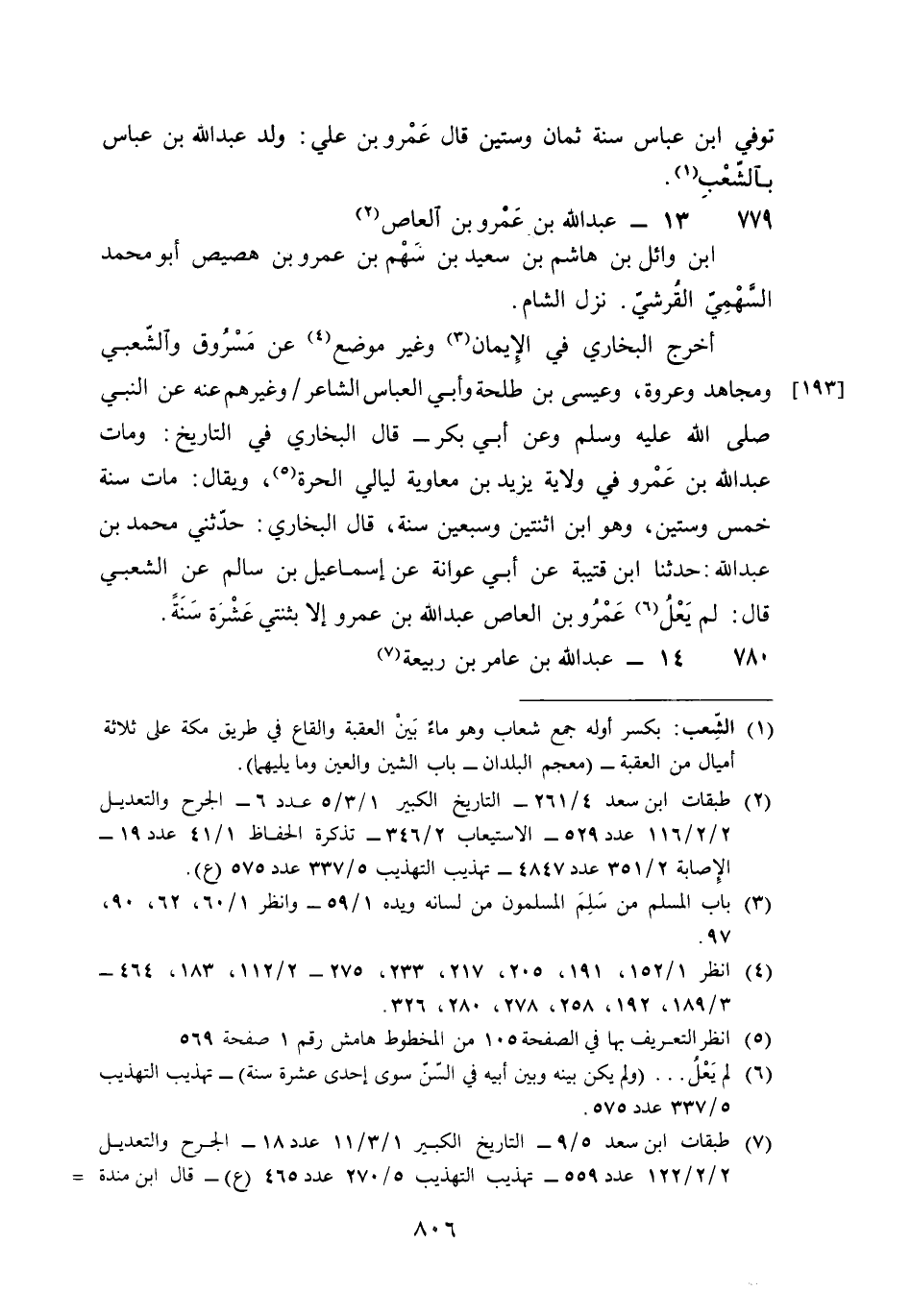 779 - عبد الله بن عَمْرو بن الْعَاصِ بن وَائِل بن هَاشم بن سعيد بن سهم بن عَمْرو بن هصيص أَبُو مُحَمَّد السَّهْمِي الْقرشِي نزل الشَّام أخرج البُخَارِيّ فِي الْإِيمَان وَغير مَوضِع عَن مَسْرُوق وَالشعْبِيّ وَمُجاهد وَعُرْوَة وَعِيسَى بن طَلْحَة وَأبي الْعَبَّاس الشَّاعِر وَغَيرهم عَنهُ عَن النَّبِي صلى الله عَلَيْهِ وَسلم وَعَن أبي بكر قَالَ البُخَارِيّ فِي التَّارِيخ وَمَات عبد الله بن عَمْرو فِي ولَايَة يزِيد بن مُعَاوِيَة ليَالِي الْحرَّة وَيُقَال مَاتَ سنة خمس وَسِتِّينَ وَهُوَ بن اثْنَتَيْنِ وَسبعين سنة قَالَ البُخَارِيّ حَدثنِي مُحَمَّد بن عبد الله حَدثنَا بن قُتَيْبَة عَن أبي عوَانَة عَن إِسْمَاعِيل بن سَالم عَن الشّعبِيّ قَالَ لم يعل عَمْرو بن الْعَاصِ عبد الله بن عَمْرو إِلَّا بثنتي عشرَة سنة