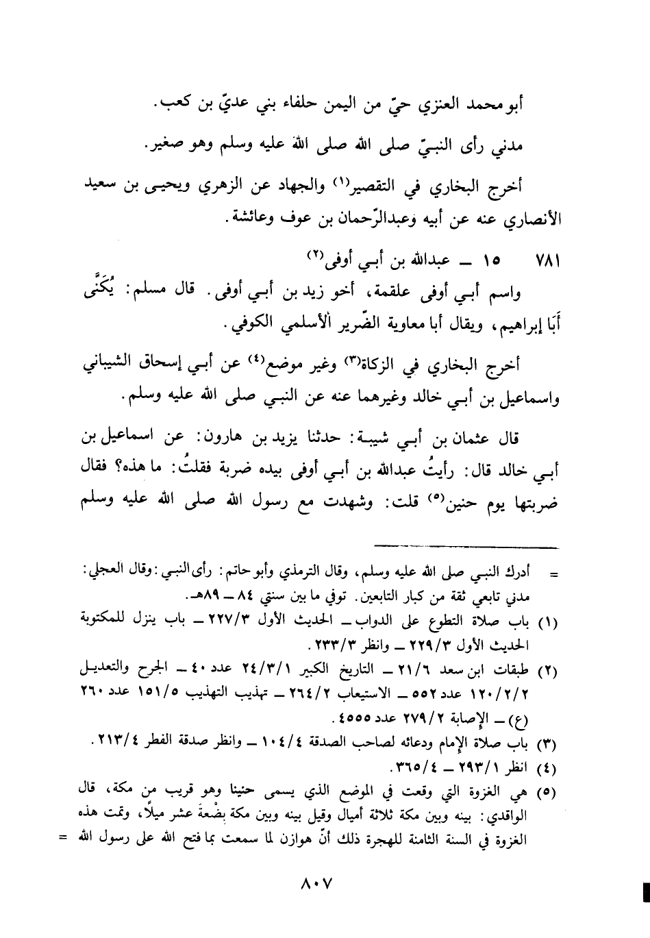 781 - عبد الله بن أبي أوفى وَاسم أبي أوفى عَلْقَمَة أَخُو زيد بن أبي أوفى قَالَ مُسلم يكنى أَبَا إِبْرَاهِيم وَيُقَال أَبَا مُعَاوِيَة الضَّرِير الْأَسْلَمِيّ الْكُوفِي أخرج البُخَارِيّ فِي الزَّكَاة وَغير مَوضِع عَن أبي إِسْحَاق الشَّيْبَانِيّ وَإِسْمَاعِيل بن أبي خَالِد وَغَيرهمَا عَنهُ عَن النَّبِي صلى الله عَلَيْهِ وَسلم قَالَ عُثْمَان بن أبي شيبَة حَدثنَا يزِيد بن هَارُون عَن إِسْمَاعِيل بن أبي خَالِد قَالَ رَأَيْت عبد الله بن أبي أوفى بِيَدِهِ ضَرْبَة فَقلت مَا هَذِه فَقَالَ ضربتها يَوْم حنين قلت وَشهِدت مَعَ رَسُول الله صلى الله عَلَيْهِ وَسلم حنينا قَالَ نعم وَقبل ذَلِك لم يذكرهُ الكلاباذي قَالَ البُخَارِيّ مَاتَ عبد الله بن أبي أوفى سنة سبع أَو ثَمَان وَثَمَانِينَ قَالَ عَمْرو بن عَليّ وَكَانَ قد ذهب بَصَره وَهُوَ آخر الصَّحَابَة موتا بِالْكُوفَةِ