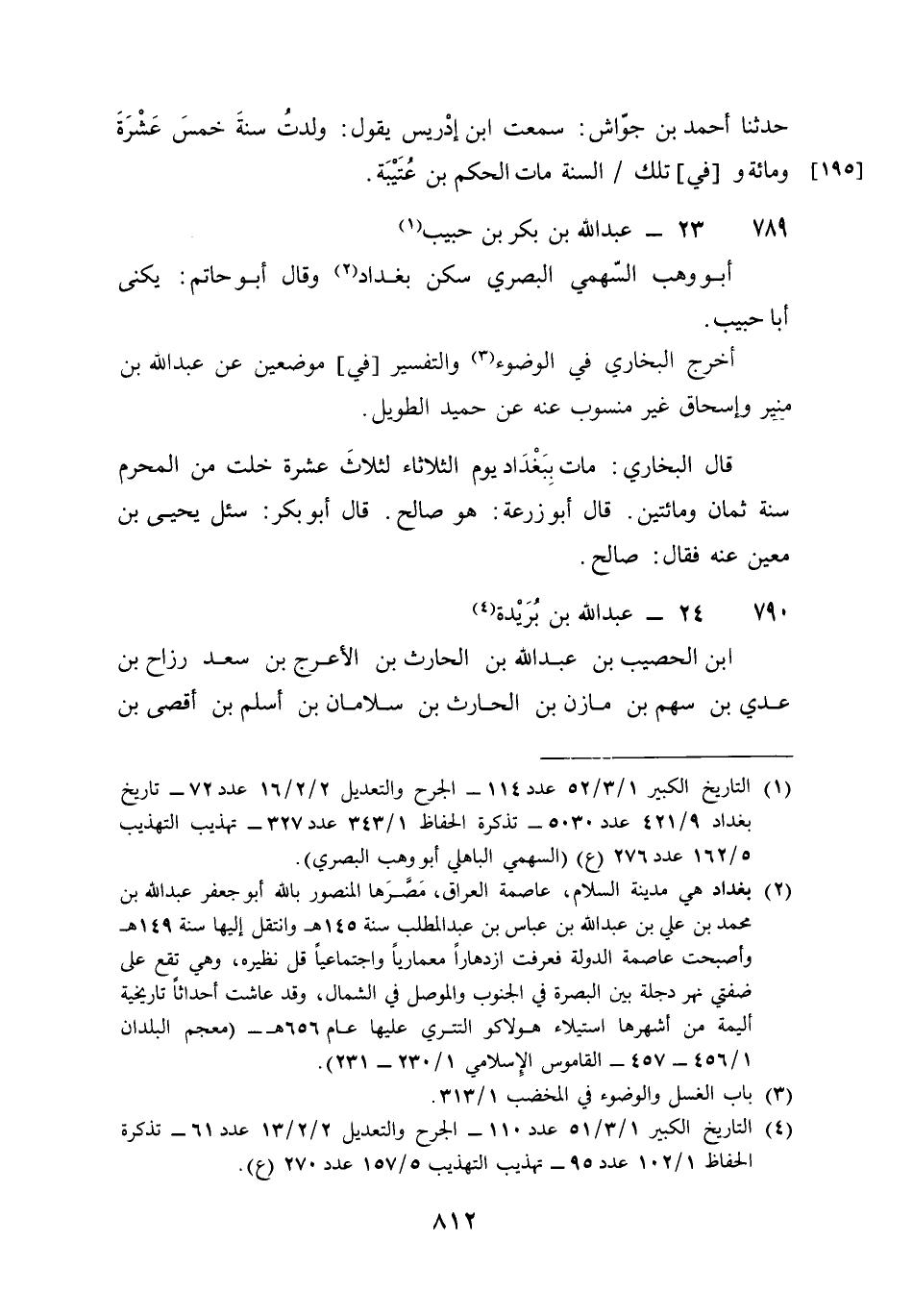 789 - عبد الله بن بكر بن حبيب أَبُو وهب السَّهْمِي الْبَصْرِيّ سكن بَغْدَاد وَقَالَ أَبُو حَاتِم يكنى أَبَا حبيب أخرج البُخَارِيّ فِي الْوضُوء وَالتَّفْسِير فِي موضِعين عَن عبد الله بن مُنِير وَإِسْحَاق غير مَنْسُوب عَنهُ عَن حميد الطَّوِيل قَالَ البُخَارِيّ مَاتَ بِبَغْدَاد يَوْم الثُّلَاثَاء لثلاث عشرَة خلت من الْمحرم سنة ثَمَان وَمِائَتَيْنِ قَالَ أَبُو زرْعَة هُوَ صَالح قَالَ أَبُو بكر سُئِلَ يحيى بن معِين عَنهُ فَقَالَ صَالح