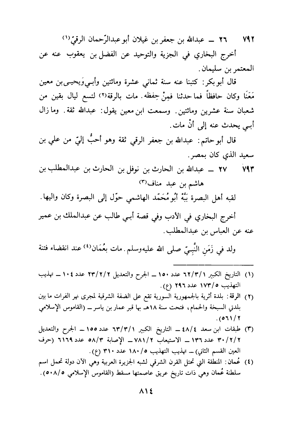792 - عبد الله بن جَعْفَر بن غيلَان أَبُو عبد الرَّحْمَن الرقي أخرج البُخَارِيّ فِي الْجِزْيَة والتوحيد عَن الْفضل بن يَعْقُوب عَنهُ عَن الْمُعْتَمِر بن سُلَيْمَان قَالَ أَبُو بكر كتبنَا عَنهُ سنة ثَمَانِي عشرَة وَمِائَتَيْنِ وَأبي وَيحيى بن معِين مَعنا وَكَانَ حَافِظًا فَمَا حَدثنَا فَمن حفظه مَاتَ بالرقة لتسْع لَيَال بَقينَ من شعْبَان سنة عشْرين وَمِائَتَيْنِ وَسمعت بن معِين يَقُول عبد الله ثِقَة وَمَا زَالَ أبي يحدث عَنهُ إِلَى أَن مَاتَ قَالَ أَبُو حَاتِم عبد الله بن جَعْفَر الرقي ثِقَة وَهُوَ أحب إِلَيّ من عَليّ بن سعيد الَّذِي كَانَ بِمصْر