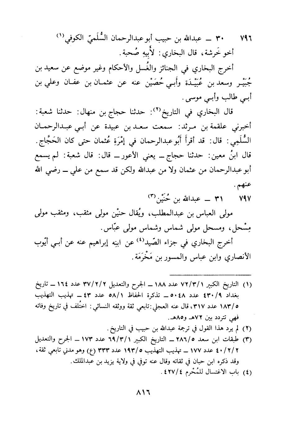 796 - عبد الله بن حبيب أَبُو عبد الرَّحْمَن السّلمِيّ الْكُوفِي أَخُو خَرشَة قَالَ البُخَارِيّ لِأَبِيهِ صُحْبَة أخرج البُخَارِيّ فِي الْجَنَائِز وَالْغسْل وَالْأَحْكَام وَغير مَوضِع عَن سعيد بن جُبَير وَسعد بن عُبَيْدَة وَأبي حُصَيْن عَنهُ عَن عُثْمَان بن عَفَّان وَعلي بن أبي طَالب وَأبي مُوسَى قَالَ البُخَارِيّ فِي التَّارِيخ حَدثنَا حجاج بن منهال حَدثنَا شُعْبَة أَخْبرنِي عَلْقَمَة بن مرْثَد سَمِعت سعد بن عُبَيْدَة عَن أبي عبد الرَّحْمَن السّلمِيّ قَالَ قد أَقرَأ أَبُو عبد الرَّحْمَن فِي إمرة عُثْمَان حَتَّى كَانَ الْحجَّاج قَالَ بن معِين حَدثنَا حجاج يَعْنِي الْأَعْوَر قَالَ قَالَ شُعْبَة لم يسمع أَبُو عبد الرَّحْمَن من عُثْمَان وَلَا من عبد الله وَلَكِن قد سمع من عَليّ رَضِي الله عَنْهُم