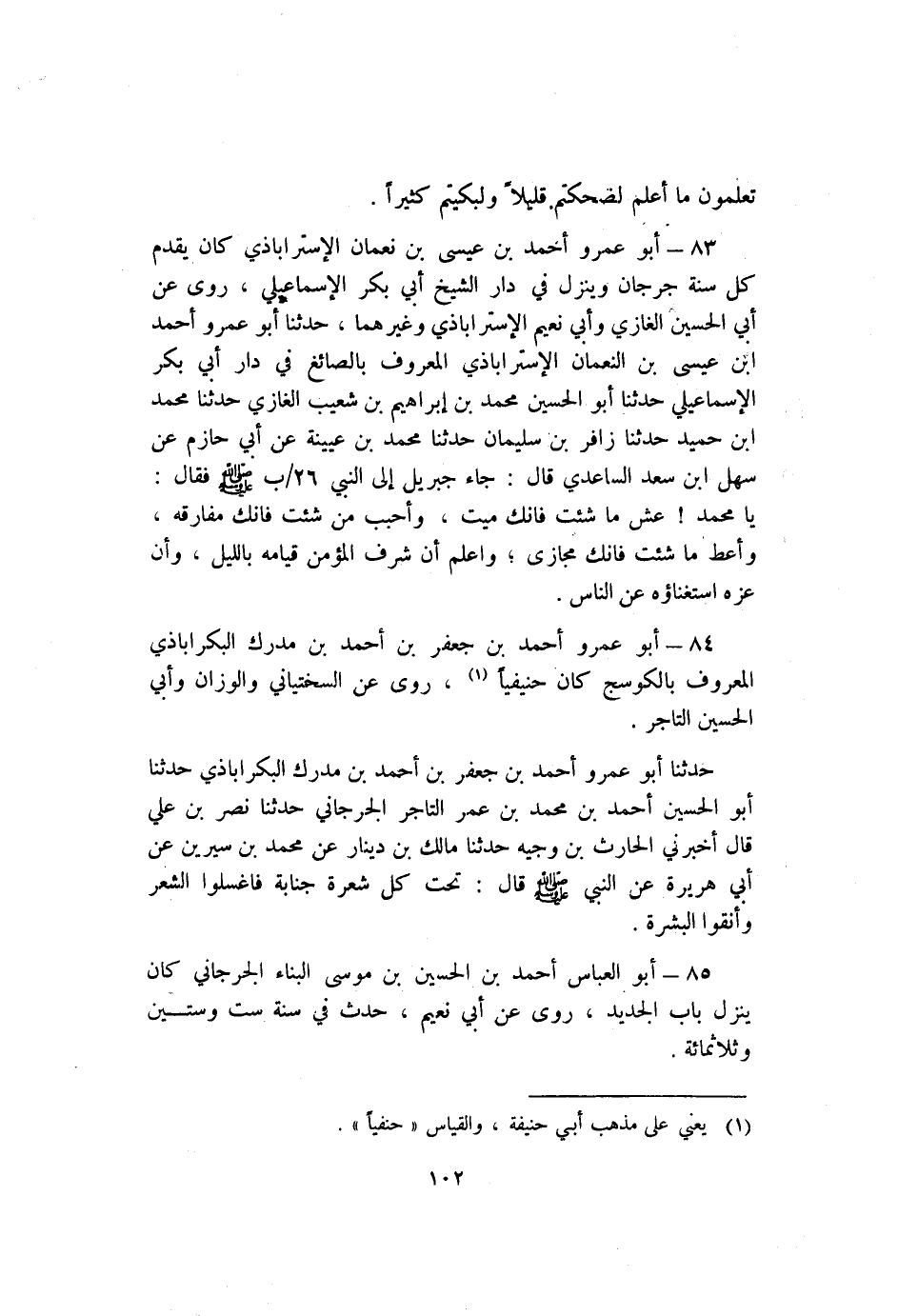 83 - أَبُو عمرو أَحْمَد بْن عيسى بْن نعمان الإستراباذي كان يقدم كل سنة جُرْجَان وينزل فِي دار الشيخ أَبِي بكر الإسماعيلي روى عَنْ أَبِي الْحُسَيْن الغازي وأبي نعيم الإستراباذي وغيرهما حَدَّثَنَا أَبُو عَمْرٍو أَحْمَدُ بْنُ عِيسَى بْنِ النُّعْمَانِ الإِسْتَرَابَاذِيُّ الْمَعْرُوفُ بِالصَّائِغِ فِي دَارِ أَبِي بَكْرٍ الإِسْمَاعِيلِيُّ حَدَّثَنَا أَبُو الْحُسَيْنِ مُحَمَّدُ بْنُ إِبْرَاهِيمَ بْنِ شُعَيْبٍ الْغَازِي حَدَّثَنَا مُحَمَّدُ بْنُ حُمَيْدٍ حَدَّثَنَا زَافِرُ بْنُ سُلَيْمَانَ حَدَّثَنَا مُحَمَّدُ بْنُ عُيَيْنَةَ عَنْ أَبِي حَازِمٍ عَنْ سَهْلِ بْنِ سَعْدٍ السَّاعِدِيِّ قَالَ: جَاءَ جِبْرِيلُ إِلَى النبي26/ب صَلَّى اللَّهُ عَلَيْهِ وَسَلَّمَ فَقَالَ: يَا مُحَمَّدُ عِشْ مَا شِئْتَ فَإِنَّكَ مَيِّتٌ وَأَحْبِبْ مَنْ شِئْتَ فَإِنَّكَ مُفَارِقُهُ وَأَعْطِ مَا شِئْتَ فَإِنَّكَ مُجَازًى وَاعْلَمْ أَنَّ شَرَفَ الْمُؤْمِنِ قِيَامُهُ بِاللَّيْلِ وَأَّن عِزَّهُ اسْتِغْنَاؤُهُ عَنِ النَّاسِ.