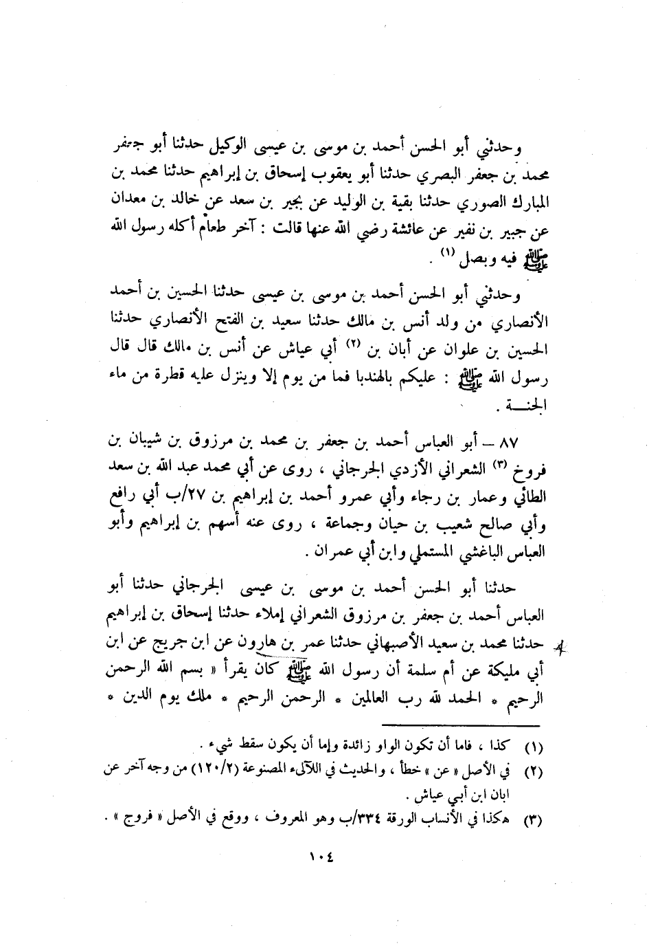 87 - أَبُو العباس أَحْمَد بْن جعفر بْن مُحَمَّد بْن مرزوق بْن شيبان بْن فروخ3 الشعراني الأزدي الْجُرْجَانِيّ روى عَنْ أَبِي مُحَمَّد عَبْد اللَّهِ بْن سعد الطائي وعمار بْن رجاء وأبي عمرو أَحْمَد بْن إبراهيم بْن 27/ب أَبِي رافع وأبي صالح شعيب بْن حيان وجماعة روى عنه أسهم بْن إبراهيم وأبو العباس الباغشي المستملي وابن أَبِي عمران.