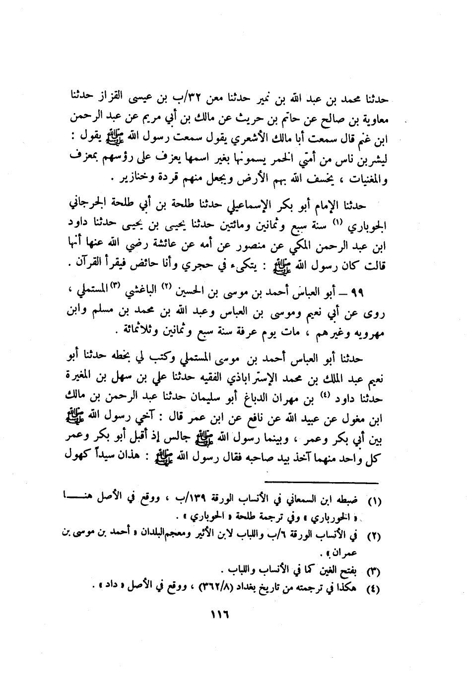 حَدَّثَنَا مُحَمَّدُ بْنُ عَبْدِ اللَّهِ بن نمير حدثنا معن32/ب بْنُ عِيسَى الْقَزَّازُ حَدَّثَنَا مُعَاوِيَةُ بْنُ صَالِحٍ عَنْ حَاتِمِ بْنِ حُرَيْثٍ عَنْ مَالِكِ بْنِ أَبِي مَرْيَمَ عَنْ عَبْدِ الرَّحْمَنِ بْنِ غَنْمٍٍ قَالَ سَمِعْتُ أَبَا مَالِكٍ الأَشْعَرِيَّ يَقُولُ سَمِعْتُ رَسُولَ اللَّهِ صَلَّى اللَّهُ عَلَيْهِ وَسَلَّمَ يَقُولُ: "لَيَشْرَبَنَّ نَاسٌ مِنْ أُمَّتِيَ الْخَمْرَ يُسَمُّونَهَا بِغَيْرِ اسْمِهَا يُعْزَفُ عَلَى رُؤُوسِهِمْ بِمَعْزَفٍ وَالْمُغَنِّيَاتُ يَخْسِفُ اللَّهُ بِهِمُ الأَرْضَ وَيَجْعَلُ مِنْهُمْ قِرَدَةً وَخَنَازِيرَ".