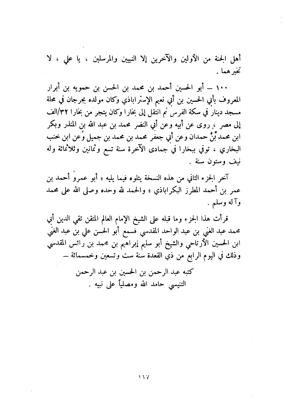 100 - أَبُو الْحُسَيْن أَحْمَد بْنُ مُحَمَّدِ بْنِ الْحَسَنِ بْنِ حمويه بْن أبرار المعروف بأبي الْحُسَيْن بْن أَبِي نعيم الإستراباذي وكان مولده بِجُرْجَانَ فِي محلة مسجد دينار فِي سكة الفرس ثم انتقل إلى بخارا وكان يتجر من بخارا 32/ألف إلى مصر روى عَنْ أَبِيهِ وعن أَبِي النضر مُحَمَّد بْن عَبْد اللَّهِ بْن المنذر وبكر بْن مُحَمَّد بْن حمدان وعن أَبِي جعفر مُحَمَّد بْن مُحَمَّد بن جميل وعن بن خنب البخاري توفي ببخارا فِي جمادى الآخرة سنة تسع وثمانين وثلاثمائة وله نيف وستون سنة.
