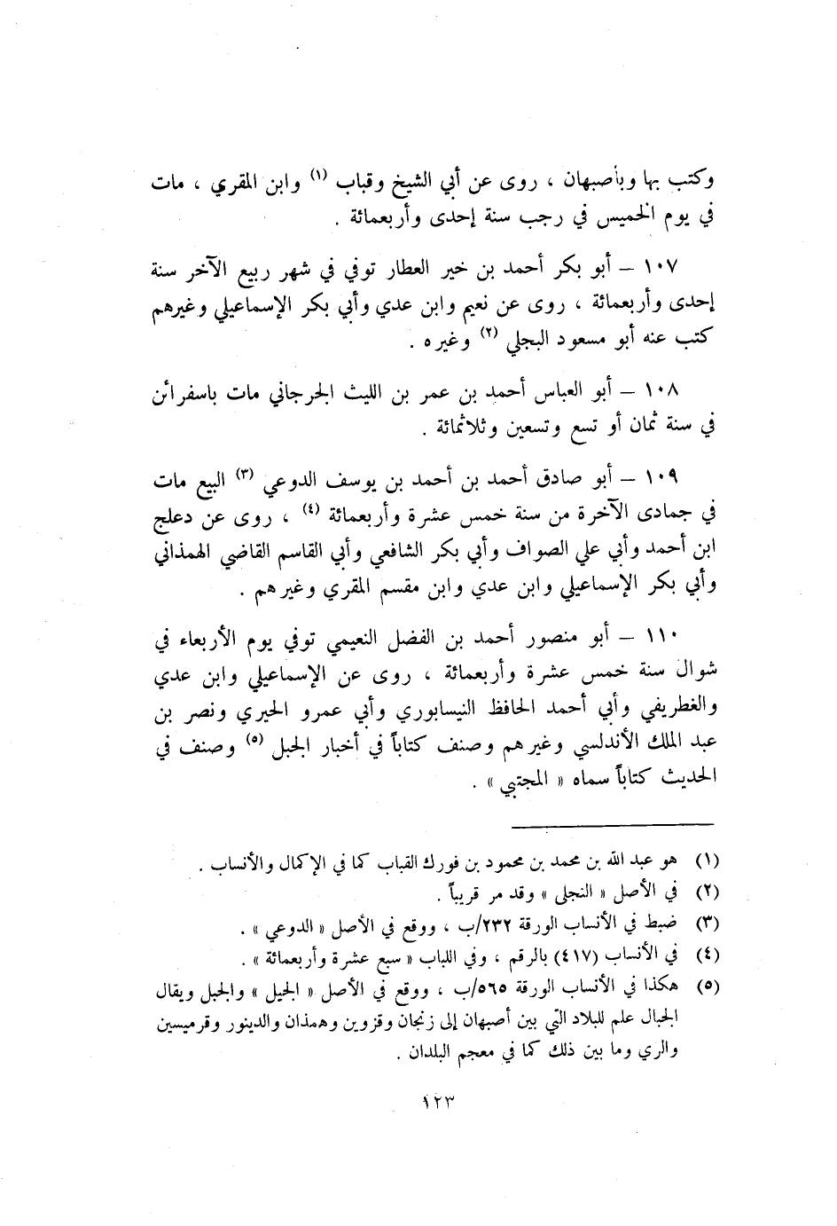 108- أَبُو العباس أَحْمَد بْن عُمَر بْن الليث الْجُرْجَانِيّ مات باسفرائن فِي سنة ثمان أَوْ تسع وتسعين وثلاثمائة.