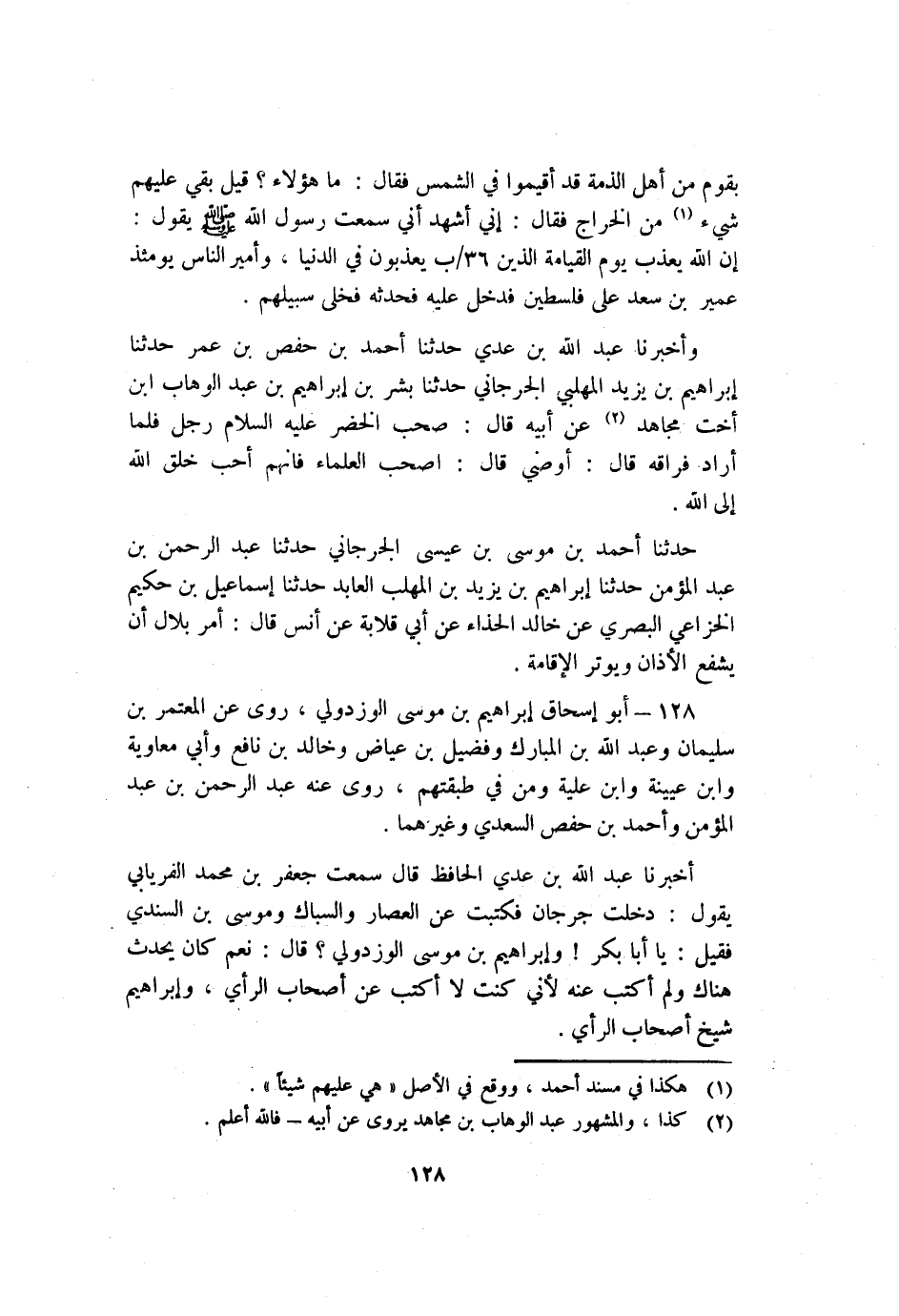 128 - أَبُو إسحاق إبراهيم بْن مُوسَى الوزدولي رَوَى عَنْ المعتمر بْن سُلَيْمَان وعبد اللَّه بْن المبارك وفضيل بْن عياض وخالد بْن نَافِع وأبي معاوية وابن عيينة وابن علية ومن فِي طبقتهم روى عنه عَبْد الرَّحْمَنِ بْن عَبْد المؤمن وأحمد بْن حفص السعدي وغيرهما.