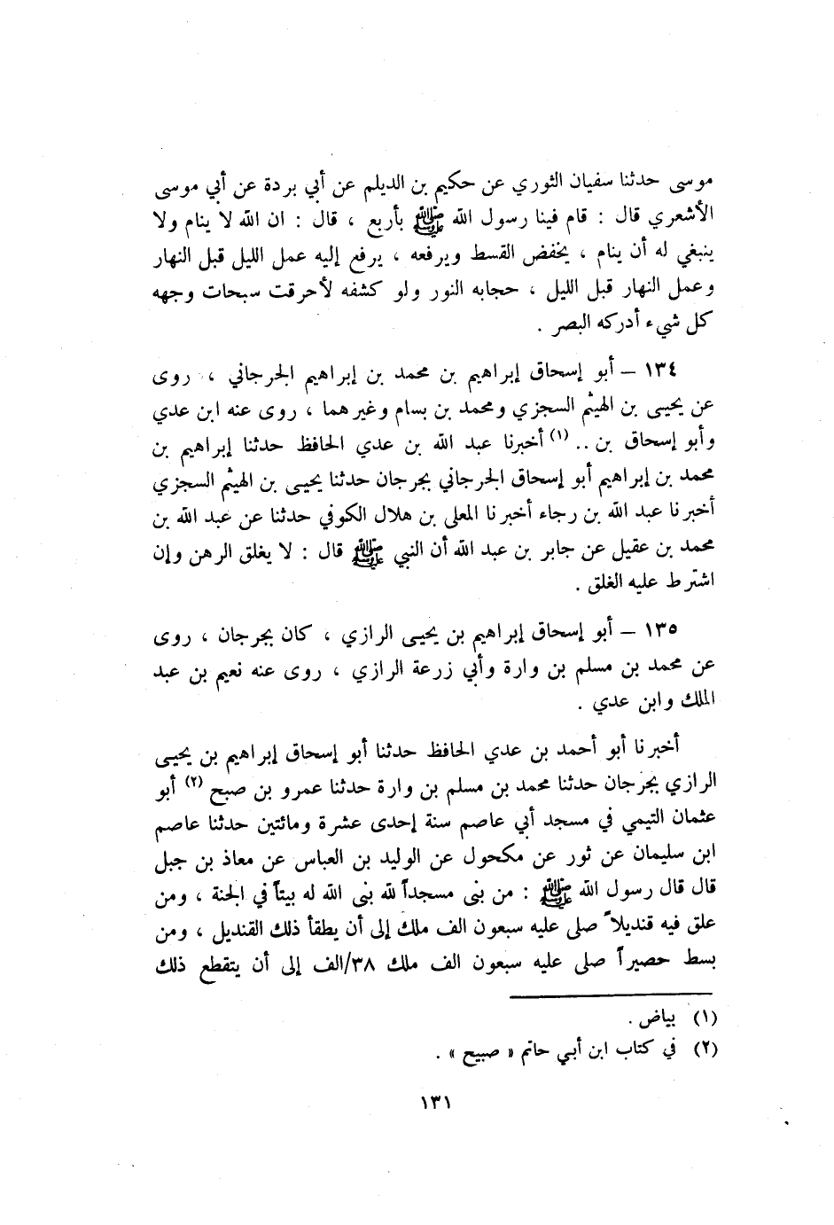 135- أَبُو إسحاق إبراهيم بْن يحيى الرَّازِيّ كان بِجُرْجَانَ روى عَنْ مُحَمَّد بْن مسلم بْن وارة وأبي زرعة الرَّازِيّ روى عنه نعيم بْن عَبْد الملك وابن عدي.