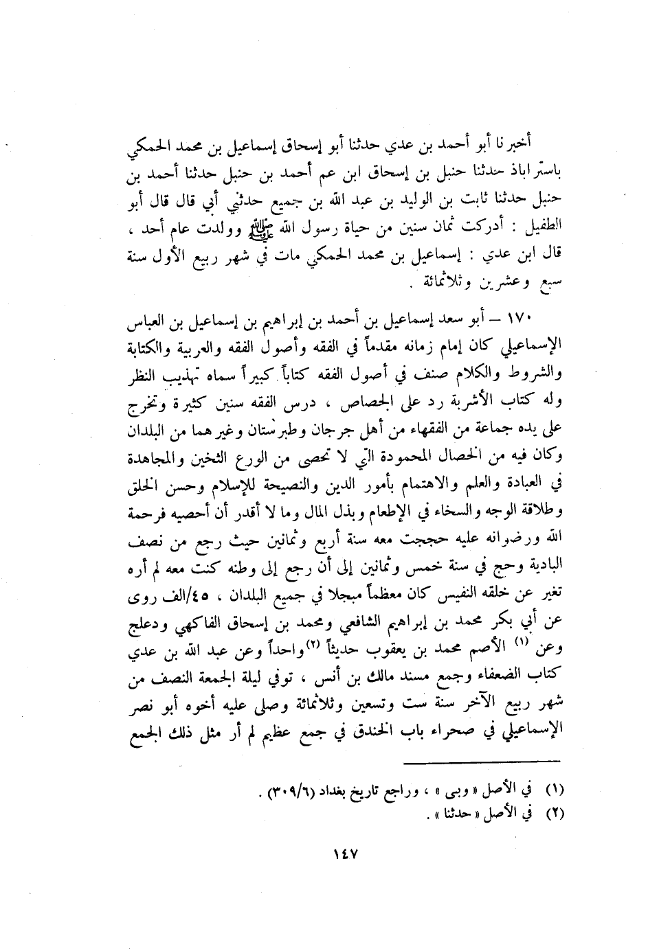 170 - أَبُو سعد إسماعيل بْن أَحْمَدُ بْنُ إِبْرَاهِيمَ بْنِ إِسْمَاعِيلَ بْن العباس الإسماعيلي كان إمام زمانه مقدما فِي الفقه وأصول الفقه والعربية والكتابة والشروط والكلام صنف فِي أصول الفقه كتابا كبيرا سماه تهذيب النظر وله كِتَاب الأشربة رد عَلَى الجصاص درس الفقه سنين كثيرة وتخرج عَلَى يده جماعة من الفقهاء من أهل جُرْجَان وطبرستان وغيرهما من البلدان وكان فيه من الخصال المحمودة التي لا تحصى من الورع الثخين والمجاهدة فِي العبادة والعلم والاهتمام بأمور الدين والنصيحة للإسلام وحسن الخلق وطلاقة الوجه والسخاء فِي الإطعام وبذل المال وما لا أقدر أن أحصيه فرحمة اللَّه ورضوانه عليه حججت معه سنة أربع وثمانين حيث رجع من نصف البادية وحج فِي سنة خمس وثمانين إلى أن رجع إلى وطنه كنت معه لم أره تغير عَنْ خلقه النفيس كان معظما مبجلا في جميع البلدان 45/ألف روى عَنْ أَبِي بكر مُحَمَّد بْن إبراهيم الشافعي ومحمد بْن إسحاق الفاكهي ودعلج وعن1 الأصم مُحَمَّد بْن يعقوب حديثا2 واحدا وعن عَبْد اللَّهِ بْن عدي كِتَاب الضعفاء وجمع مسند مالك بْن أنس توفي ليلة الجمعة النصف من شهر ربيع الآخر سنة ست وتسعين وثلاثمائة وصلى عليه أخوه أَبُو نصر الإسماعيلي فِي صحراء باب الخندق فِي جمع عظيم لم أر مثل ذلك الجمع