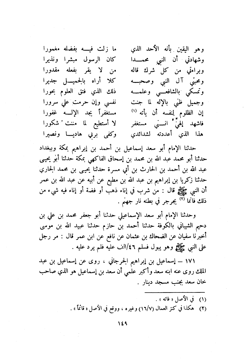 حَدَّثَنَا الإِمَامُ أَبُو سَعْدٍ إِسْمَاعِيلُ بْنُ أَحْمَدَ بْنِ إِبْرَاهِيمَ بِمَكَّةَ وَبِبَغْدَادَ حَدَّثَنَا أَبُو مُحَمَّدٍ عَبْدُ اللَّهِ بْنُ مُحَمَّدِ بْنِ إِسْحَاقَ الْفَاكِهِيُّ بِمَكَّةَ حَدَّثَنَا أَبُو يَحْيَى عَبْدُ اللَّهِ بْنُ أَحْمَدَ بْنِ الْحَارِثِ بْنِ أَبِي مَسَرَّةَ حَدَّثَنَا يَحْيَى بْنُ مُحَمَّدٍ الْجَارِي حَدَّثَنَا زَكَرِيَّا بْنُ إِبْرَاهِيمَ بْنُ عَبْدِ اللَّهِ بْنِ مُطِيعٍ عَنْ أَبِيهِ عَنْ عَبْدِ اللَّهِ بْنِ عُمَرَ أَن ّالنَّبِيَّ صَلَّى اللَّهُ عَلَيْهِ وَسَلَّمَ قَالَ: "مَنْ شَرِبَ فِي إِنَاءٍ مِنْ ذَهَبٍ أَوْ فِضَّةٍ أَوْ إِنَاءٍ فِيهِ شَيْءٌ مِنْ ذِلَك فَإِنَّمَا 2 يُجَرْجِرُ فِي بَطْنِهِ نَارَ جَهَنَّمَ".
