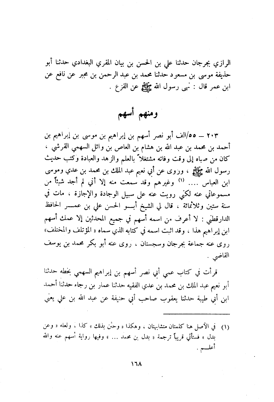 203- 55/ألف أَبُو نصر أسهم بْن إبراهيم بْن مُوسَى بْن إبراهيم بْن أَحْمَدُ بْنُ مُحَمَّدِ بْنِ عَبْدِ اللَّهِ بْن هشام بْن العاص بْن وائل السهمي القرشي كان من صباه إلى وقت وفاته مشتغلا بالعلم والزهد والعبادة وكتب حديث رسول اللَّه صلى اللَّه عليه وسلم وروى عَنْ أَبِي نُعَيْمٍ عَبْدُ الْمَلِكِ بْنُ مُحَمَّدِ بْن عدي وموسى بْن العباس....1 وغيرهم وقد سمعت منه إلا أني لم أجد شيئا من مسموعاتي عنه لكني رويت عنه عَلَى سبيل الوجادة والإجازة مات فِي سنة ستين وثلاثمائة قَالَ لي الشيخ أَبُو الْحَسَن عَلِيّ بْن عُمَر الحافظ الدارقطني لا أعرف من اسمه أسهم فِي جميع المحدثين إلا عمك أسهم بْن إبراهيم هذا وقد اثبت اسمه فِي كتابه الذي سماه المؤتلف والمختلف روى عنه جماعة بِجُرْجَانَ وسجستان روى عنه أَبُو بكر مُحَمَّد بْن يُوسُف القاضي.