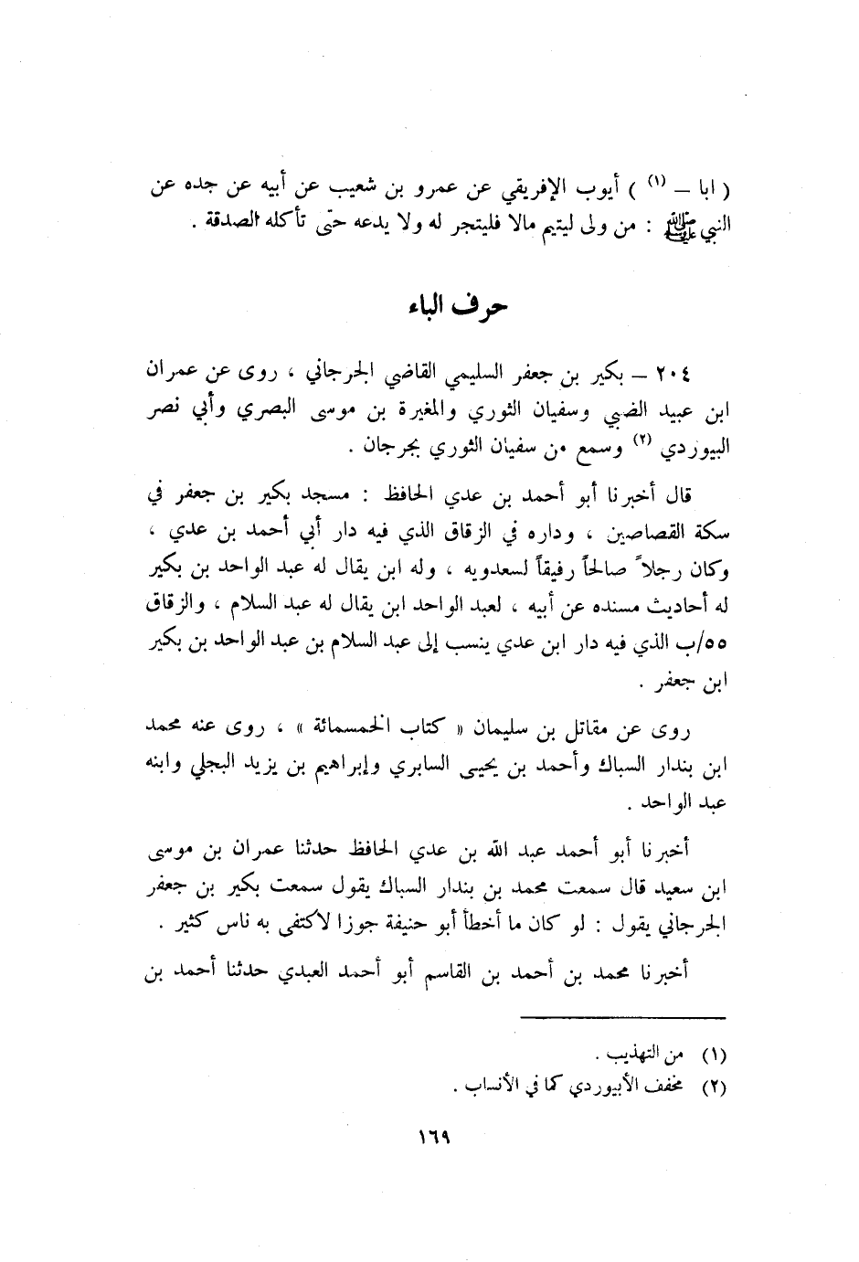 204- بكير بْن جعفر السليمي القاضي الْجُرْجَانِيّ روى عَنْ عمران بْن عبيد الضبي وسفيان الثوري والمغيرة بْن مُوسَى البصري وأبي نصر البيوردي1 وسمع من سفيان الثوري بِجُرْجَانَ.