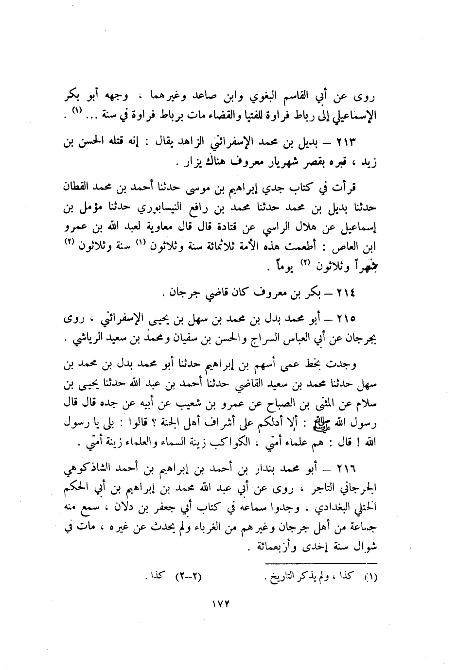 215- أَبُو مُحَمَّد بدل بْن مُحَمَّد بْن سهل بْن يحيى الإسفرائيني روى بِجُرْجَانَ عَنْ أَبِي العباس السراج والحسن بْن سفيان ومحمد بْن سعيد الرياشي.