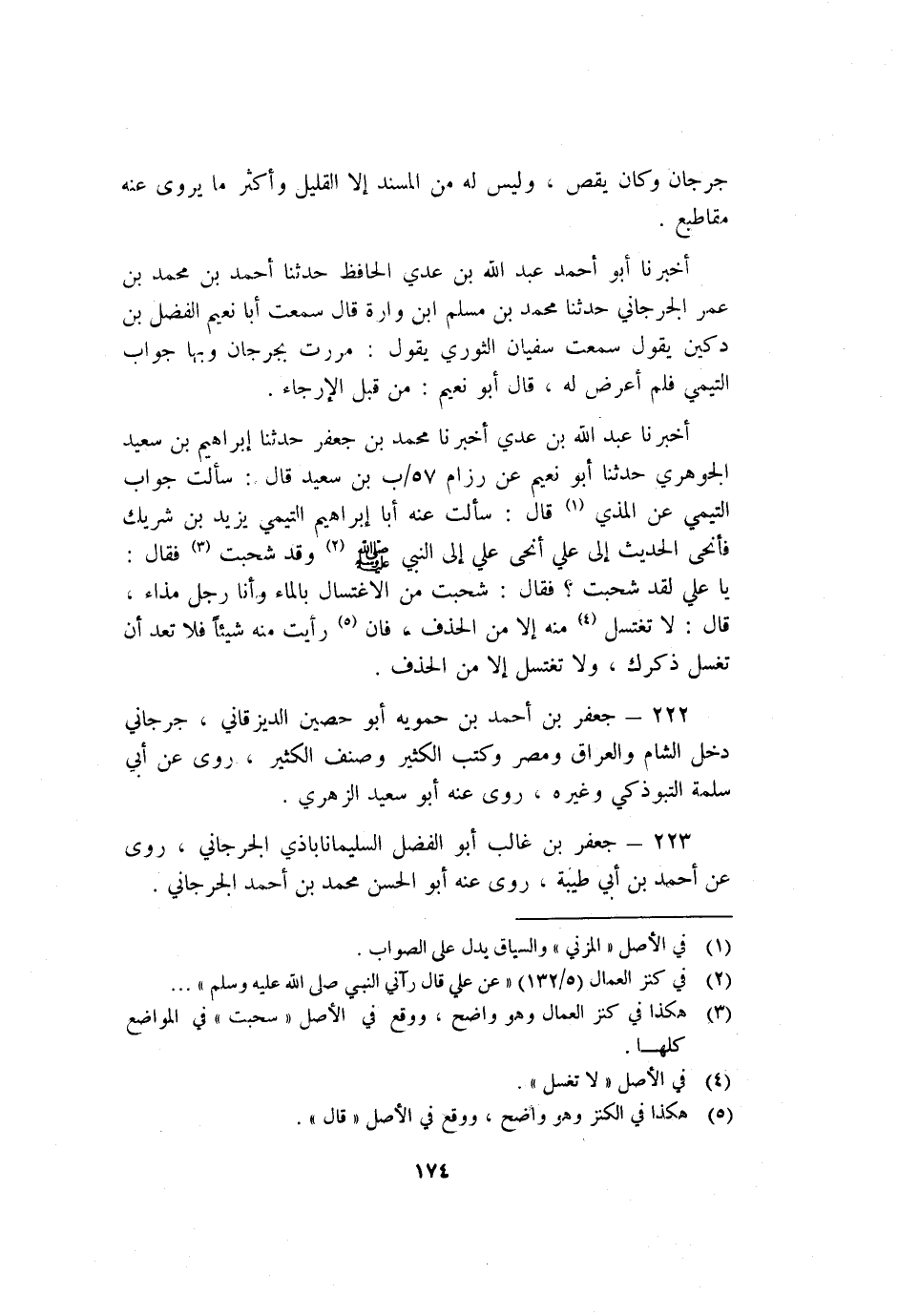 أَخْبَرَنَا عَبْدُ اللَّهِ بْنُ عَدِيٍّ أَخْبَرَنَا مُحَمَّدُ بْنُ جَعْفَرٍ حَدَّثَنَا إِبْرَاهِيمُ بْنُ سَعِيدٍ الْجَوْهَرِيُّ حَدَّثَنَا أَبُو نُعَيْمٍ عن رزام 57/ب بن سعيد قال سألت جواب التيمي عَنِ الْمَذْيِ1 قَالَ سَأَلْتُ عَنْهُ أَبَا إِبْرَاهِيمَ التَّيْمِيَّ يَزِيدَ بْنَ شَرِيكٍ فَأَنْحَى الْحَدِيثَ إِلَى عَلِيٍّ أَنْحَى عَلِيٌّ إِلَى النَّبِيِّ صَلَّى اللَّهُ عَلَيْهِ وَسَلَّمَ2 وَقَدْ شَحُبْتُ3 فَقَالَ: "يَا عَلِيُّ لَقَدْ شَحُبْتَ"؟ فَقَالَ: شَحُبْتُ مِنَ الاغْتِسَالِ بِالْمَاءِ وَأَنَا رَجُلٌ مَذَّاءٌ قَالَ: "لا تَغْتَسِلْ 4 مِنْهُ إِلا مِنَ الْحَذْفِ فَإِنْ 5 رَأَيْتَ مِنْهُ شَيْئًا فَلا تَعُدْ أَنْ تَغْسِلَ ذَكَرَكَ وَلا تَغْتَسِلْ إِلا مِنَ الْحَذْفِ".
