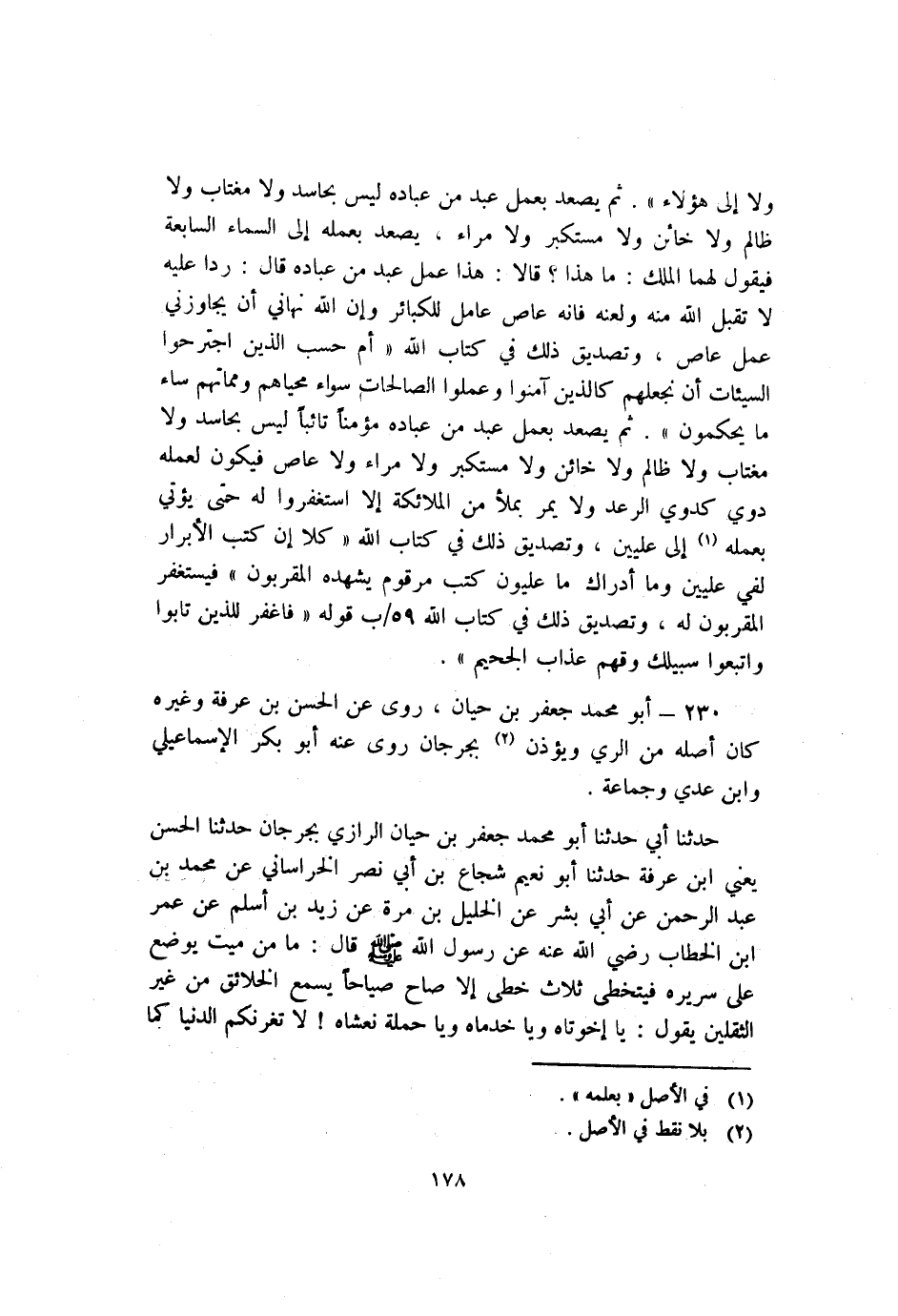 وَلا إِلَى هَؤُلاءِ} [النساء: 143] ثُمَّ يَصْعَدُ بِعَمَلِ عَبْدٍ مِنْ عِبَادِهِ لَيْسَ بِحَاسِدٍ وَلا مُغْتَابٍ وَلا ظَالِمٍ وَلا خَائِنٍ وَلا مُسْتَكْبِرٍ وَلا مُرَاءٍ يَصْعَدُ بِعَمَلِهِ إِلَى السَّمَاءِ السَّابِعَةِ فَيَقُولُ لَهُمَا الْمَلَكُ: مَا هَذَا؟ قَالا: هَذَا عَمَلُ عَبْدٍ مِنْ عِبَادِهِ قَالَ: رُدَّا عَلَيْهِ لا تَقَبَّلَ اللَّهُ مِنْهُ وَلَعَنَهُ فَإِنَّهُ عَاصٍ عَامِلٍ لِلْكَبَائِرِ وَإِنَّ اللَّهَ نَهَانِي أَنْ يُجَاوِزَنِي عَمَلُ عَاصٍ وَتَصْدِيقُ ذَلِكَ فِي كتاب الله أم حسب {أَمْ حَسِبَ الَّذِينَ اجْتَرَحُوا السَّيِّئَاتِ أَنْ نَجْعَلَهُمْ كَالَّذِينَ آمَنُوا وَعَمِلُوا الصَّالِحَاتِ سَوَاءً مَحْيَاهُمْ وَمَمَاتُهُمْ سَاءَ مَا يَحْكُمُونَ} [الجاثية:21] ثُمَّ يَصْعَدُ بِعَمَلِ عَبْدٍ مِنْ عِبَادِهِ مُؤْمِنًا تَائِبًا لَيْسَ بِحَاسِدٍ وَلا مُغْتَابٍ وَلا ظَالِمٍ وَلا خَائِنٍ وَلا مُسْتَكْبِرٍ وَلا مُرَاءٍ وَلا عَاصٍ فَيَكُونُ لِعَمَلِهِ دَوِيٌّ كَدَوِيِّ الرَّعْدِ وَلا يَمُرُّ بِمَلأٍ مِنَ الْمَلائِكَةِ إِلا اسْتَغْفَرُوا لَهُ حَتَّى يُؤْتَى بِعَمَلِهِ1 إِلَى عِلِّيِّينَ وَتَصْدِيقُ ذَلِكَ فِي كِتَابِ اللَّهِ {كَلَّا إِنَّ كِتَابَ الْأَبْرَارِ لَفِي عِلِّيِّينَ وَمَا أَدْرَاكَ مَا عِلِّيُّونَ كِتَابٌ مَرْقُومٌ يَشْهَدُهُ الْمُقَرَّبُونَ} [المطففين:21] فَيَسْتَغْفِرُ الْمُقَرَّبُونَ لَهُ وَتَصْدِيقُ ذَلِكَ فِي كِتَابِ الله 59/ب قَوْلُهُ: {فَاغْفِرْ لِلَّذِينَ تَابُوا وَاتَّبَعُوا سَبِيلَكَ وَقِهِمْ عَذَابَ الْجَحِيمِ} [غافر:7]