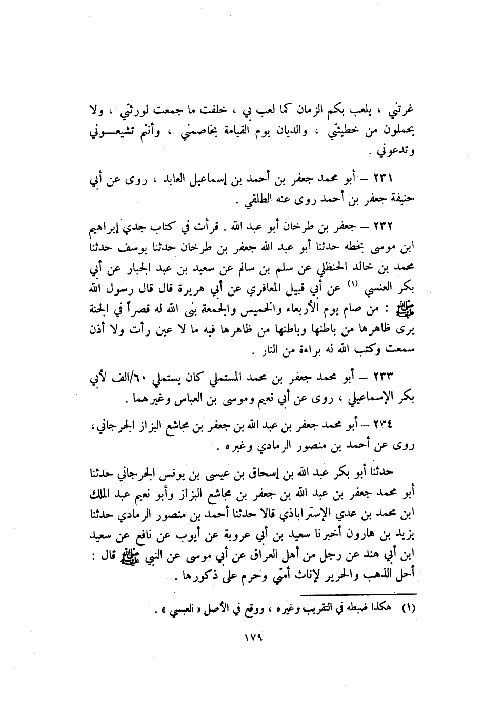 231 - أَبُو مُحَمَّد جعفر بْن أَحْمَدَ بْن إسماعيل العابد روى عَنْ أَبِي حنيفة جعفر بْن أَحْمَدَ روى عنه الطلقي.