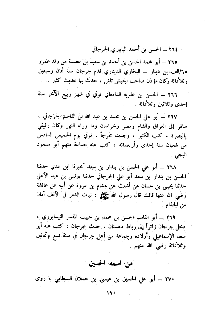 269- أَبُو القاسم الْحَسَنُ بْنُ مُحَمَّدِ بْنِ حَبِيبٍ المفسر النيسابوري دخل جُرْجَان زائرا إلى رباط دهستان حدث بِجُرْجَانَ كتب عنه أَبُو سعد الإسماعيلي وأولاده وجماعة من أهل جُرْجَان فِي سنة تسع وثمانين وثلاثمائة رضي اللَّه عنهم