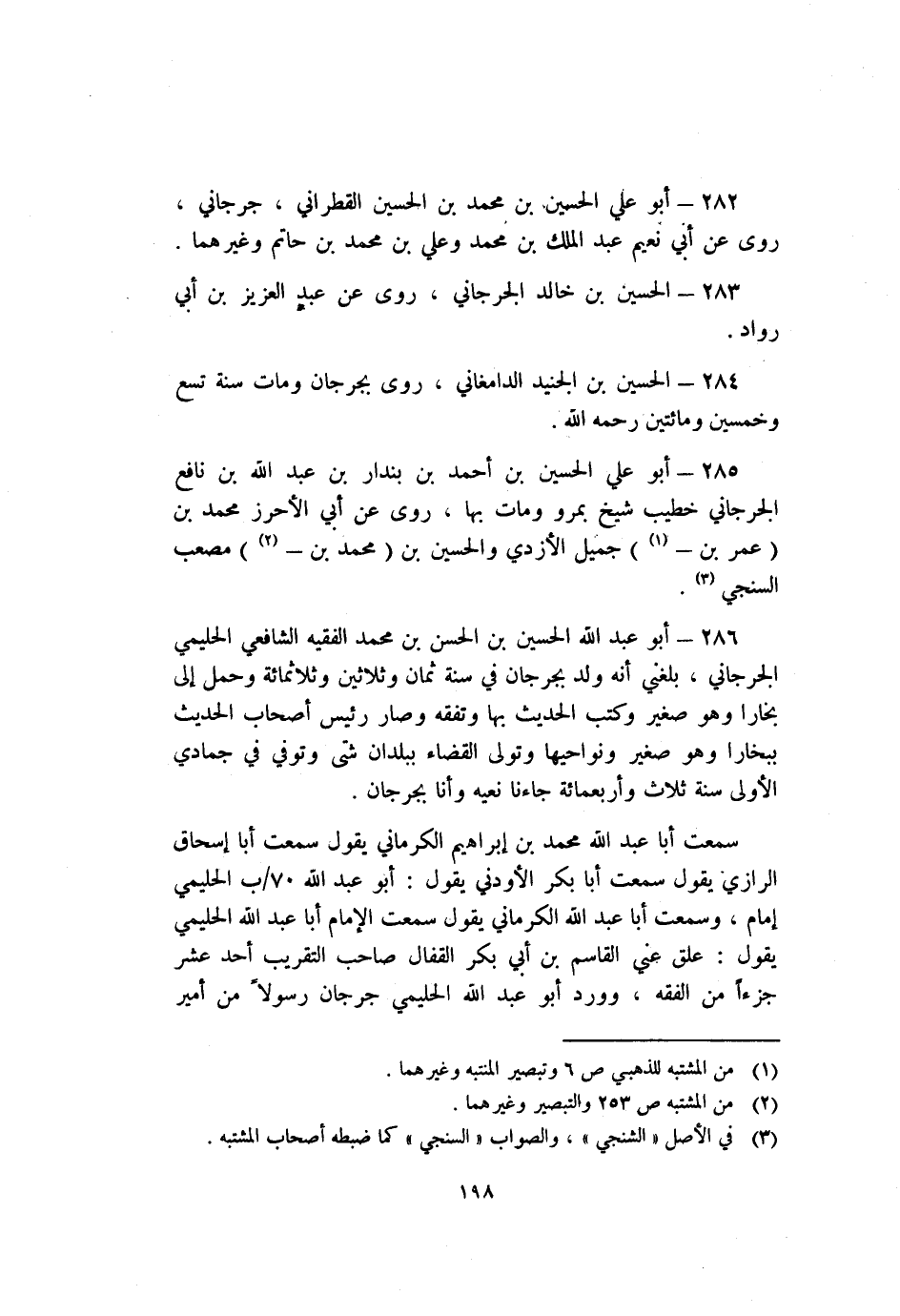 286- أَبُو عَبْد اللَّهِ الْحُسَيْن بْن الْحَسَن بْن مُحَمَّد الفقيه الشافعي الحليمي الْجُرْجَانِيّ بلغني أنه ولد بِجُرْجَانَ فِي سنة ثمان وثلاثين وثلاثمائة وحمل إلى بخارا وهو صغير وكتب الحديث بها وتفقه وصار رئيس أصحاب الحديث ببخارا وهو صغير ونواحيها وتولى القضاء ببلدان شتى وتوفي فِي جمادي الأولى سنة ثلاث وأربعمائة جاءنا نعيه وأنا بِجُرْجَانَ.