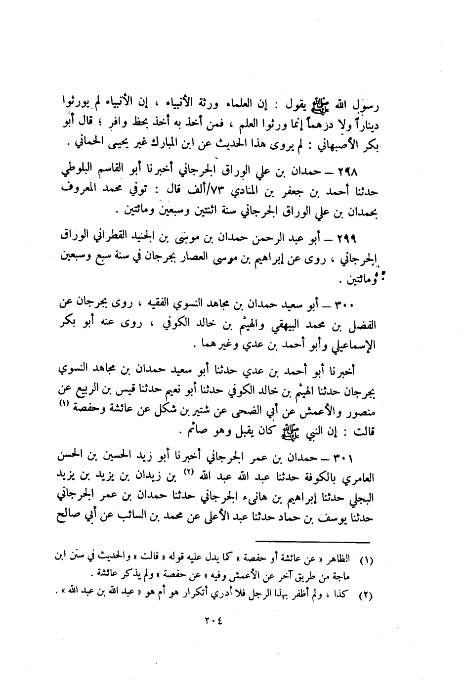 299- أَبُو عَبْد الرَّحْمَنِ حمدان بْن مُوسَى بْن الجنيد القطراني الوراق الْجُرْجَانِيّ روى عَنْ إبراهيم بْن مُوسَى العصار بِجُرْجَانَ فِي سنة سبع وسبعين ومائتين.