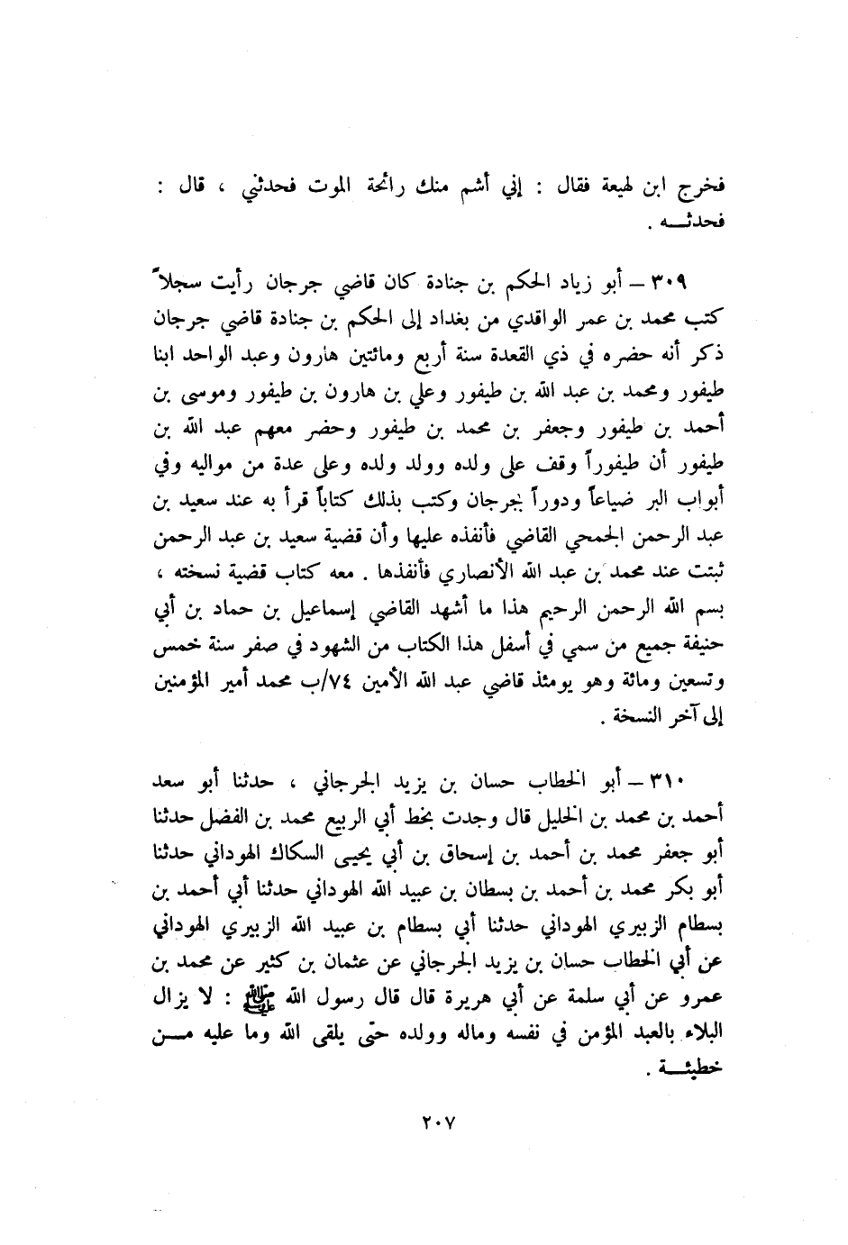 309 - أَبُو زياد الحكم بْن جنادة كان قاضي جُرْجَان رَأَيْت سجلا كتب مُحَمَّد بْن عمرو الواقدي من بغداد إلى الحكم بْن جنادة قاضي جُرْجَان ذكر أنه حضره فِي ذي القعدة سنة أربع ومائتين هارون وعبد الواحد ابنا طيفور ومحمد بْن عَبْد اللَّهِ بْن طيفور وعلي بْن هارون بْن طيفور وموسى بْن أَحْمَدَ بْن طيفور وجعفر بْن مُحَمَّد بْن طيفور وحضر معهم عَبْد اللَّهِ بْن طيفور أن طيفورا وقف عَلَى ولده وولد ولده وعلى عدة من مواليه وفي أبواب البر ضياعا ودورا بِجُرْجَانَ وكتب بذلك كتابا قرأ به عند سعيد بْن عَبْد الرَّحْمَنِ الجمحي القاضي فأنفذه عليها وأن قضية سعيد بْن عَبْد الرَّحْمَنِ ثبتت عند مُحَمَّد بْن عَبْد اللَّهِ الأنصاري فأنفذها معه كِتَاب قضية نسخته بسم اللَّه الرحمن الرحيم هذا ما أشهد القاضي إسماعيل بْن حماد بْن أَبِي حنيفة جميع من سمي فِي أسفل هذا الكتاب من الشهود فِي صفر سنة خمس وتسعين ومائة وهو يومئذ قاضي عَبْد اللَّهِ الأمين 74/ب مُحَمَّد أمير المؤمنين إلى آخر النسخة.