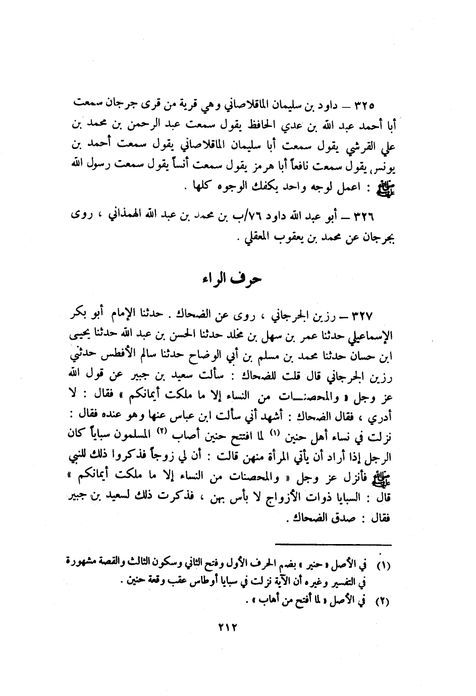 327- رزين الْجُرْجَانِيّ روى عَنْ الضحاك حَدَّثَنَا الإِمَامُ أَبُو بَكْرٍ الإِسْمَاعِيلِيُّ حَدَّثَنَا عُمَرُ بْنُ سَهْلِ بْنِ مَخْلَدٍ حَدَّثَنَا الْحَسَنُ بْنُ عَبْدِ اللَّهِ حَدَّثَنَا يَحْيَى بْنُ حَسَّانٍ حَدَّثَنَا مُحَمَّدُ بْنُ مُسْلِمِ بْنِ أَبِي الْوَضَّاحِ حَدَّثَنَا سَالِمٌ الأَفْطَسُ حَدَّثَنِي رَزِينٌ الْجُرْجَانِيُّ قَالَ: قُلْتُ لِلضَّحَّاكِ: سَأَلْتُ سَعِيدَ بْنَ جُبَيْرٍ عَنْ قَوْلِ اللَّهِ عَزَّ وَجَلّ: {وَالْمُحْصَنَاتُ مِنَ النِّسَاءِ إِلَّا مَا مَلَكَتْ أَيْمَانُكُمْ} فَقَالَ: لا أَدْرِي فَقَالَ الضَّحَّاكُ أَشْهَدُ أَنِّي سَأَلْتُ ابْنَ عَبَّاسٍ عَنْهَا وَهُوَ عِنْدَهُ فَقَالَ: نَزَلَتْ فِي نِسَاءِ أَهْلِ حُنَيْنٍ1 لَمَّا افْتُتِحَ حُنَيْنٌ أَصَابَ2 الْمُسْلِمُونَ سَبَايَا كَانَ الرَّجُلُ إِذَا أَرَادَ أَنْ يَأْتِيَ الْمَرْأَةَ مِنْهُنَّ قَالَتْ: إِنَّ لِي زَوْجًا فَذَكَرُوا ذَلِكَ لِلنَّبِيِّ صَلَّى اللَّهُ عَلَيْهِ وَسَلَّمَ فَأَنْزَلَ عَزَّ وَجَلّ: {وَالْمُحْصَنَاتُ مِنَ النِّسَاءِ إِلَّا مَا مَلَكَتْ أَيْمَانُكُمْ} قَالَ: السَّبَايَا ذَوَاتُ الأَزْوَاجِ لا بَأْسَ بِهِنَّ فذكرت ذلك لسعيد بْن جبير فقال: صدق الضحاك.