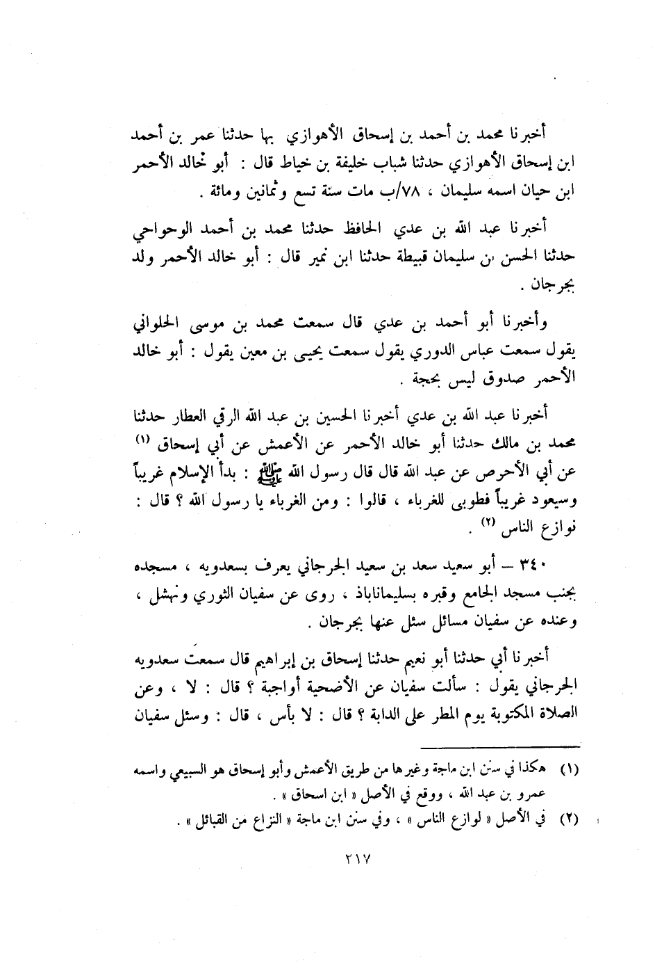 أَخْبَرَنَا عَبْدُ اللَّهِ بْنُ عَدِيٍّ أَخْبَرَنَا الْحُسَيْنُ بْنُ عَبْدِ اللَّهِ الرَّقِّيُّ الْعَطَّارُ حَدَّثَنَا مُحَمَّدُ بْنُ مَالِكٍ حَدَّثَنَا أَبُو خَالِدٍ الأَحْمَرُ عَنِ الأَعْمَشِ عَنْ أَبِي إِسْحَاقَ1 عَنْ أَبِي الأَحْوَصِ عَنْ عَبْدِ اللَّهِ قَالَ: قَالَ رَسُولُ اللَّهِ صَلَّى اللَّهُ عَلَيْهِ وَسَلَّمَ: "بَدَأَ الإِسْلامُ غَرِيبًا وَسَيَعُودُ غَرِيبًا فَطُوبَى لِلْغُرَبَاءِ" قَالُوا: وَمَنِ الْغُرَبَاءُ يَا رَسُولَ اللَّهِ قَالَ: "نَوَازِعُ النَّاسِ" 2.