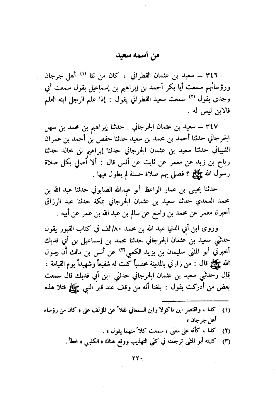 346- سعيد بْن عثمان القطراني كان من نتا1 أهل جُرْجَان ورؤسائهم سمعت أبا بَكْرٍ أَحْمَدُ بْنُ إِبْرَاهِيمَ بْنِ إسماعيل يقول سمعت أَبِي وجدي يقول2 سمعت سعيد القطراني يقول إذا علم الرجل ابنه العلم فالابن ليس له.