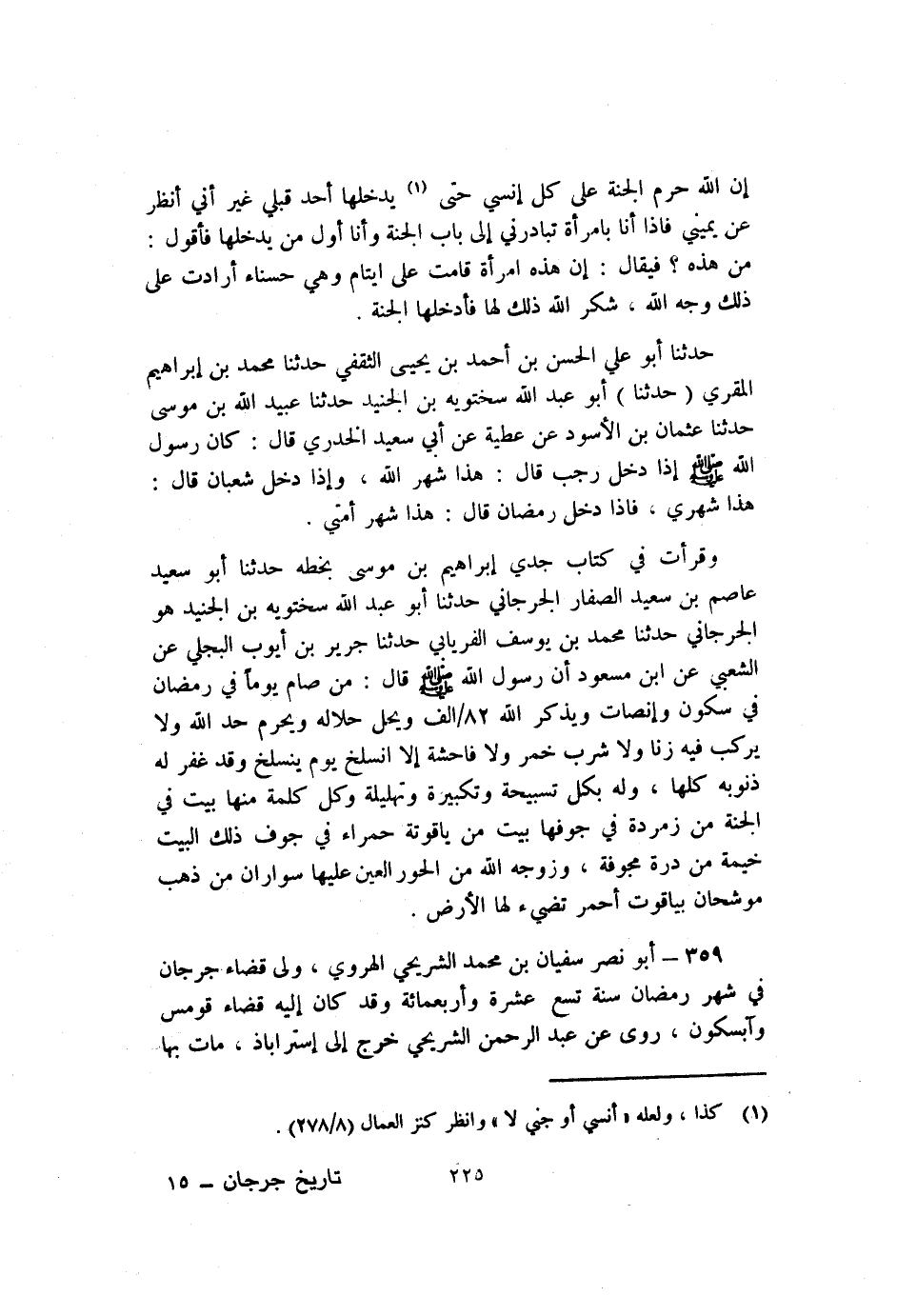 وَقَرَأْتُ فِي كِتَابِ جَدِّي إِبْرَاهِيمَ بْن مُوسَى بِخَطِّهِ حَدَثَّنَا أَبُو سَعِيدٍ عَاصِمُ بْنُ سَعِيدٍ الصَّفَّارُ الْجُرْجَانِيُّ حَدَّثَنَا أَبُو عَبْدِ اللَّهِ سَخْتَوَيْهِ بْنُ الْجُنَيْدِ هُوَ الْجُرْجَانِيُّ حَدَّثَنَا مُحَمَّدُ بْنُ يُوسُفَ الْفِرْيَابِيُّ حَدَّثَنَا جَرِيرُ بْنُ أَيُّوبَ الْبَجَلِيُّ عن الشعبي عن بن مَسْعُودٍ أَن ّرَسُولَ اللَّهِ صَلَّى اللَّهُ عَلَيْهِ وَسَلَّمَ قَالَ: "مَنْ صَامَ يَوْمًا فِي رَمَضَانَ فِي سكون وإنصات ويذكر الله 82/ألف وَيُحِلُّ حَلالَهُ وَيُحَرِّمُ حَدَّ اللَّهِ وَلا يَرْكَبُ فِيهِ زِنًا وَلا شُرْبَ خَمْرٍ وَلا فَاحِشَةً إِلا انْسَلَخَ يَوْمَ يَنْسَلِخُ وَقَدْ غُفِرَ لَهُ ذُنُوبُهُ كُلُّهَا وَلَهُ بِكُلِّ تَسْبِيحَةٍ وَتَكْبِيرَةٍ وَتَهْلِيلَةٍ وَكُلِّ كَلِمَةٍ مِنْهَا بَيْتٌ فِي الْجَنَّةِ مِنْ زُمُرُّدَةٍ فِي جَوْفِهَا بَيْتٌ مِنْ يَاقُوتَةٍ حَمْرَاءَ فِي جَوْفِ ذَلِكَ الْبَيْتِ خَيْمَةٌ مِنْ دُرَّةٍ مُجَوَّفَةٍ وَزَوَّجَهُ اللَّهُ مِنَ الْحُورِ الْعِينِ عَلَيْهَا سِوَارَانِ مِنْ ذَهَبٍ مُوَشَّحَانِ بِيَاقُوتٍ أَحْمَرَ تُضِيءُ لَهَا الأَرْضُ".