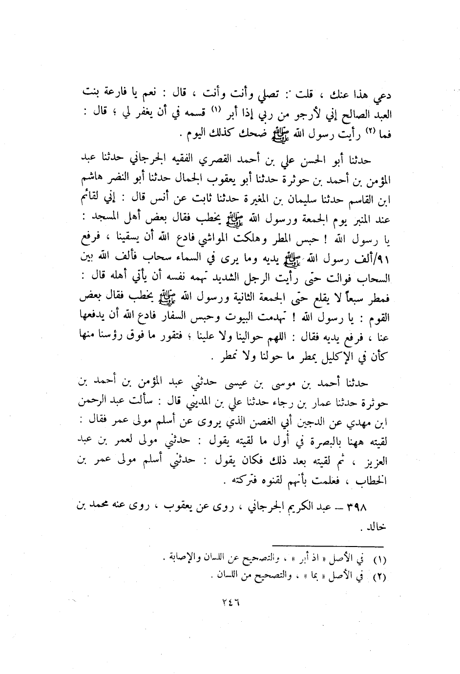 حَدَّثَنَا أَبُو الْحَسَنِ عَلِيُّ بْنُ أَحْمَدَ الْقَصْرِيُّ الْفَقِيهُ الْجُرْجَانِيُّ حَدَّثَنَا عَبْدُ الْمُؤْمِنِ بْنُ أَحْمَدَ بْنِ حَوْثَرَةَ حَدَّثَنَا أَبُو يَعْقُوبَ الْجَمَّالُ حَدَّثَنَا أَبُو النَّضْرِ هَاشِمُ بْنُ الْقَاسِمِ حَدَّثَنَا سُلَيْمَانُ بْنُ الْمُغِيرَةِ حَدَّثَنَا ثَابِتٌ عَنْ أَنَسٍ قَالَ: إِنِّي لَقَائِمٌ عِنْدَ الْمِنْبَرِ يَوْمَ الْجُمُعَةِ وَرَسُولُ اللَّهِ صَلَّى اللَّهُ عَلَيْهِ وَسَلَّمَ يَخْطُبُ فَقَالَ بَعْضُ أَهْلِ الْمَسْجِدِ: يَا رَسُولَ اللَّهِ حُبِسَ الْمَطَرُ وَهَلَكَتِ الْمَوَاشِي فَادْعُ اللَّهَ أَنْ يَسْقِيَنَا فرفع 91/ألف رَسُولِ اللَّهِ صَلَّى اللَّهُ عَلَيْهِ وَسَلَّمَ يَدَيْهِ وَمَا يُرَى فِي السَّمَاءِ سَحَابٌ فَأَلَّفَ اللَّهُ بَيْنَ السَّحَابِ فَوَالَتْ حَتَّى رَأَيْتُ الرَّجُلَ الشَّدِيدَ تَهُمُّهُ نَفْسُهُ أَنْ يَأْتِيَ أَهْلَهُ قَالَ فَمُطِرَ سَبْعًا لا يُقْلِعُ حَتَّى الْجُمُعَةِ الثَّانِيَةِ وَرَسُولُ اللَّهِ صَلَّى اللَّهُ عَلَيْهِ وَسَلَّمَ يَخْطُبُ فَقَالَ بَعْضُ الْقَوْمِ: يَا رَسُولَ اللَّهِ تَهَدَّمَتِ الْبُيُوتُ وَحُبِسَ السُّفَّارُ فَادْعُ اللَّهَ أَنْ يَدْفَعَهَا عَنَّا فَرَفَعَ يَدَيْهِ فَقَالَ: "اللَّهُمَّ حَوَالَيْنَا وَلا عَلَيْنَا" فَتَقَوَّرَ مَا فَوْقَ رُؤُوسِنَا مِنْهَا كَأَنَّ فِي الإِكْلِيلِ يُمْطِرُ مَا حَوْلَنَا وَلا نُمْطِرُ.