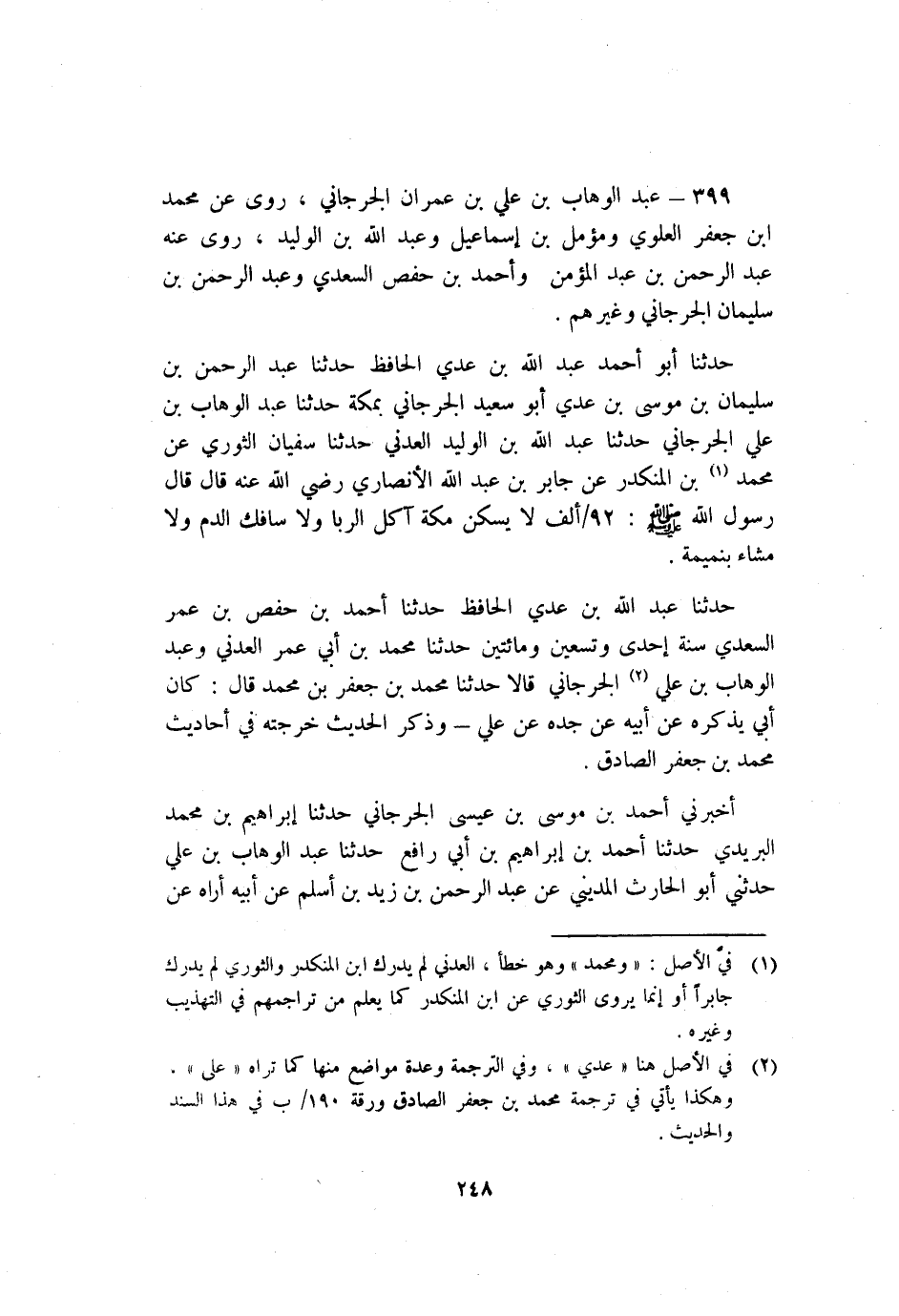 حَدَّثَنَا أَبُو أَحْمَدَ عَبْد اللَّهِ بْن عدي الحافظ حَدَّثَنَا عَبْدُ الرَّحْمَنِ بْنُ سُلَيْمَانَ بْنِ مُوسَى بْنِ عَدِيٍّ أَبُو سَعِيدٍ الْجُرْجَانِيُّ بِمَكَّةَ حَدَّثَنَا عَبْدُ الْوَهَّابِ بْنِ عَلِيٍّ الْجُرْجَانِيُّ حَدَّثَنَا عَبْدُ اللَّهِ بْنُ الْوَلِيدِ الْعَدَنِيُّ حَدَّثَنَا سُفْيَانُ الثَّوْرِيُّ عَنْ مُحَمَّدِ1 بْنِ الْمُنْكَدِرِ عَنْ جَابِرِ بْنِ عَبْدِ اللَّهِ الأَنْصَارِيِّ رَضِيَ اللَّه عَنْهُ قَالَ: قَالَ رَسُولُ اللَّهِ صلى الله عليه وسلم: 92/ألف "لا يَسْكُنُ مَكَّةَ آَكِلُ الرِّبَا وَلا سَافِكُ الدَّمِ وَلا مَشَّاءٌ بِنَمِيمَةٍ".