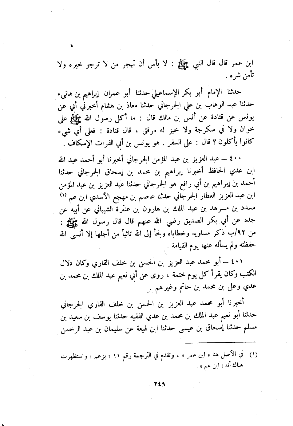 401- أَبُو مُحَمَّد عَبْد الْعَزِيز بْن الْحَسَن بْن خلف القاري وَكَانَ دلال الكتب وَكَانَ يقرأ كُل يَوْم ختمة روى عَنْ أَبِي نعيم عَبْد الْمَلِكِ بْنُ مُحَمَّدِ بْنِ عَدِيٍّ وعلي بْن مُحَمَّد بْن حَاتِم وغيرهم. أَخْبَرَنَا أَبُو مُحَمَّدٍ عَبْدُ الْعَزِيز بْن الْحَسَن بْن خلف الْقَارِيُّ الْجُرْجَانِيُّ حَدَّثَنَا أَبُو نُعَيْمٍ عَبْدُ الْمَلِكِ بْنُ مُحَمَّدِ بْنِ عَدِيٍّ الْفَقِيهُ حَدَّثَنَا يُوسُفُ بْنُ سَعِيدِ بْنِ مُسْلِمٍ حَدَّثَنَا إِسْحَاقُ بن عيسى حدثنا بن لَهِيعَةَ عَنْ سُلَيْمَانَ بْنَ عَبْدِ الرحمن