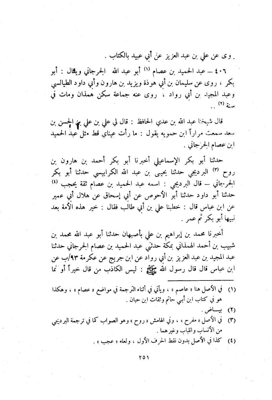 406 - عَبْد الحميد بْن عِصَام1 أَبُو عَبْد اللَّهِ الْجُرْجَانِي ويقال أبو بكر روى عَنْ سُلَيْمَان بْن أَبِي هوذة ويزيد بْن هَارُون وأبي دَاوُد الطيالسي وعبد المجيد بْن أَبِي رواد رَوَى عَنْهُ جَمَاعَة سكن همذان وَمَاتَ فِي سَنَة2.