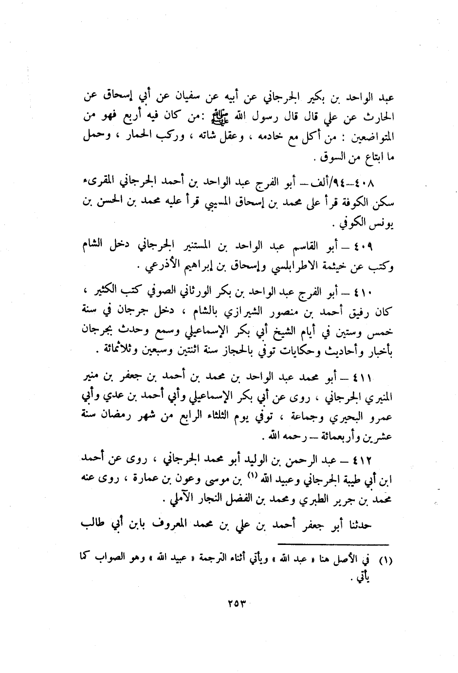410- أَبُو الفرج عَبْد الْوَاحِد بْن بَكْر الورثاني الصوفي كتب الكثير كَانَ رفيق أَحْمَد بْن مَنْصُور الشيرازي بالشام دَخَلَ جُرْجَان فِي سَنَة خمس وستين فِي أَيَّام الشيخ أَبِي بَكْر الإِسْمَاعِيلِي وسمع وحدث بِجُرْجَانَ بأخبار وأحاديث وحكايات توفي بالحجاز سَنَة اثنتين وسبعين وثلاثمائة.